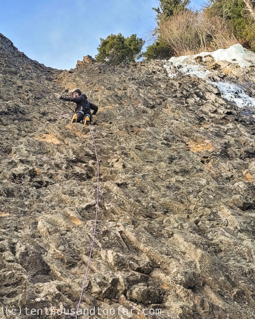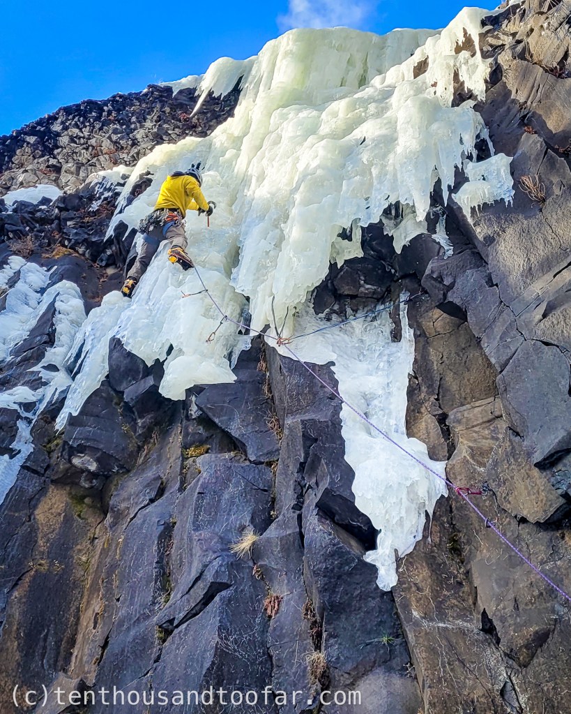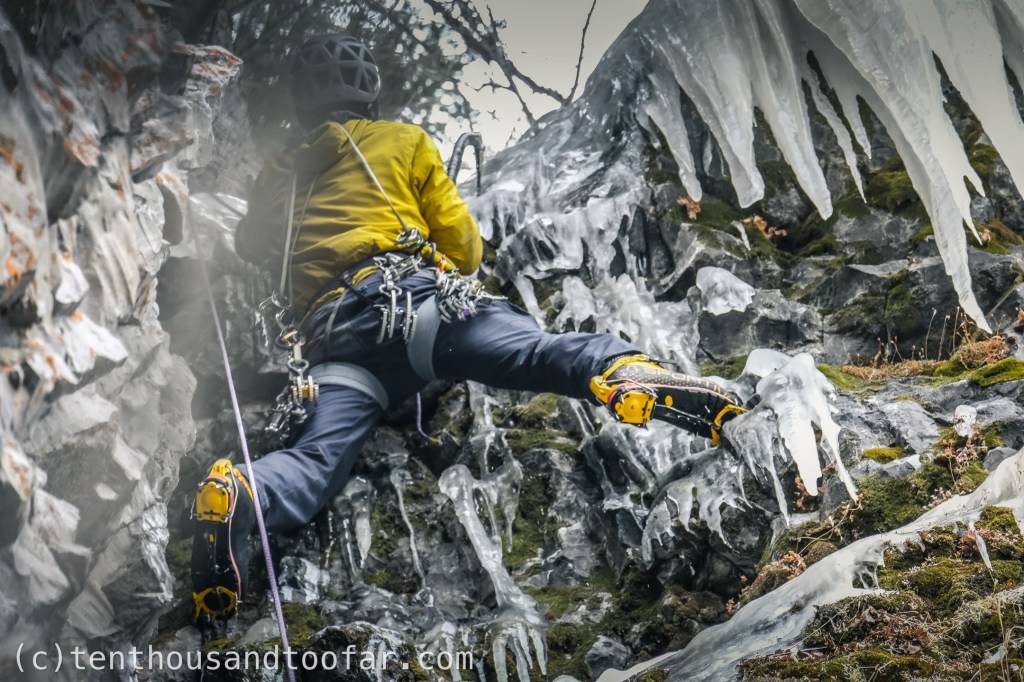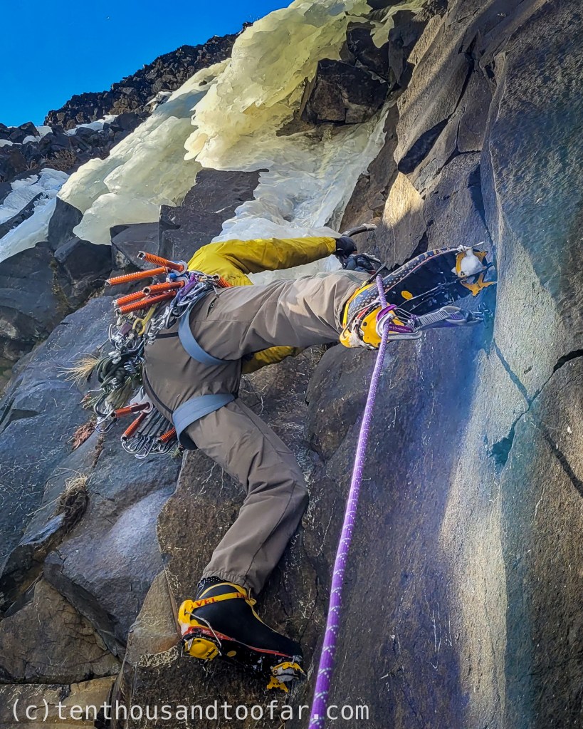 The ice above the turf pod was steep as all Jesus, but was well traveled and provided many sinker hooks for efficient progress. Chris lead boldly and successfully at an alarming rate, and despite being pumped out of my noggin I managed a no-falls follow – that is, after I fell four times trying to pull off the ground. I learned four distinct things through my short time spent on Mummy Four: