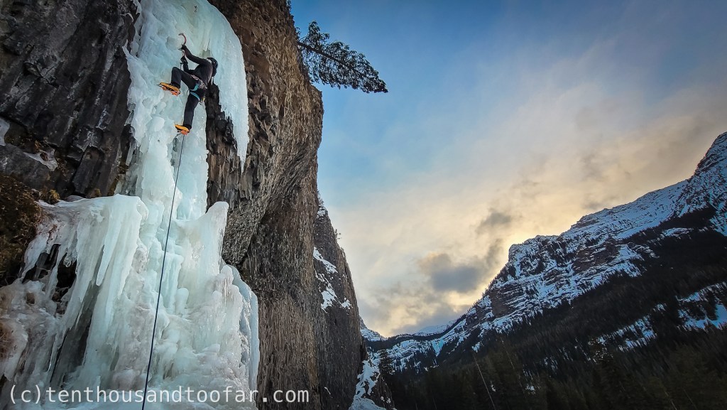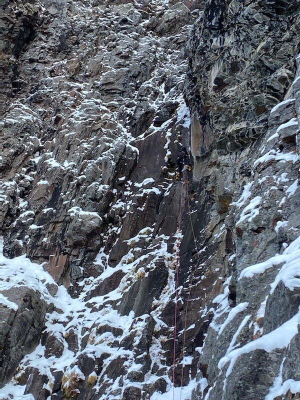 Mummy Three began much as expected, low angle but technical dry tooling with excellent small gear and reliable hooks. A few turf ledges provided full rests between difficult sections and kept the mood casual. After 20M a steep headwall was encountered where I knew before ever setting mono-points to andesite I was in for some difficult climbing. The technical crux was a steep 13M dihedral that began fully dry and ended with shallow grove sporting minimal protection and few uninspiring lunchbox sized ice blobs. Stemming on small edges, scratching around for shallow hooks and mental composure became the name of the game, as the climbing wasn’t particularly pumpy, but rather evoked difficulty through insecurity. Old screw holes in the disappointing blobs hinted that ice once formed lower on the route, likely making this stretch easier, both in technicality and protection. By the time I reached the low angle ice hose resistant but ultimately willing to accept 10cm stubbies, I was at least 10M runout above a yellow Black Diamond C3 placed in a shallow groove. In full, my lead probably clocked somewhere around 60 minutes, a wearing marathon of mental fortitude that felt significantly harder and more dangerous than the assigned M5 grade, but provided a memorable rope length of varied climbing styles and the perfect test of my current abilities as a winter climber. In line with popular mountain project opinions and the consensus of two other climbers on Upper Mummy that weekend, a better grade for Mummy Three in dry conditions is likely M6 R – whew.