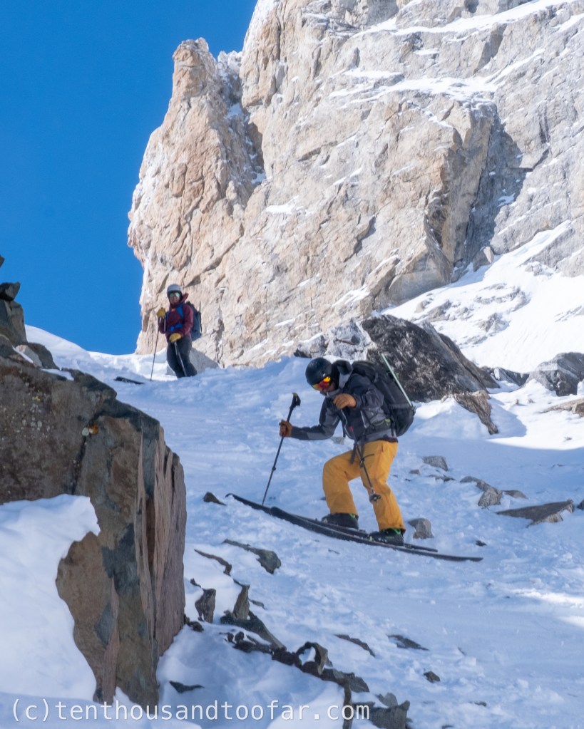With a line as rarely descended as the HM, I don’t think there is a consensus way to do it. This party had a tremendous amount of experience, at least a decade of high level and professional skiing in the Tetons – very comfortable in steep terrain on their skis, and at least one member of the team had descended before – also, presumably, with extensive beta from past descentionists. IMO, climbing it ground-up would be the preferred style, both for the classic N Face GT mixed climbing and the ability to scout anchors, snow quality, etc. for descent. I think descending top-down without strong knowledge of the route would be… ill advised? But I guess the downside of climbing it directly would be the heavier packs, rack, rope and tech gear required, along with earlier start, and higher likelihood of taking too long? Personally, I’m a ground up kind of guy – if only for the peace of mind.
