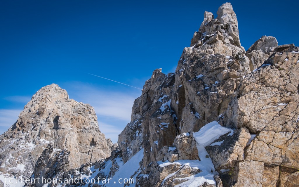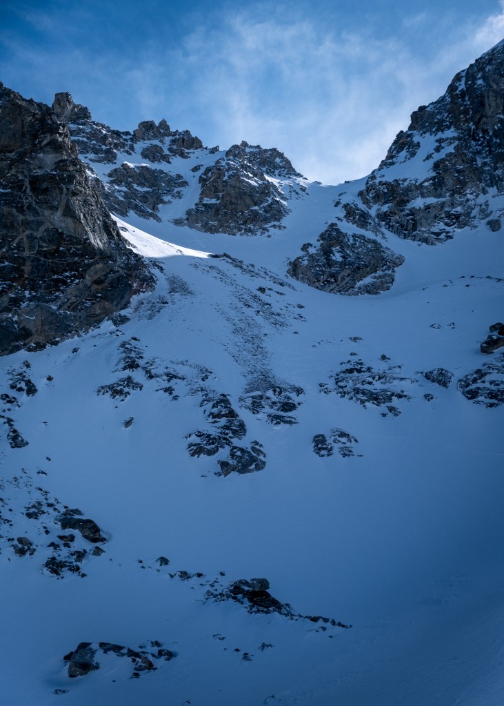 Drunk on high-pressure I was compelled to return to GTNP no more than 15 hours after leaving it… with a work shift in-between. The day before I enjoyed a mostly solo tour between Garnet Canyon and Glacial Gulch, bagging 7,500 feet of worthy skiing. Today, after lifting produce boxes at Barrels & Bins for the first three hours of my morning, I was headed back to Garnet with an open mind. My ideas swirled between north facing short approach fare. The lower micro-couloir west of the West Hourglass? Spaulding Peak? Who knows – let’s just ski something!