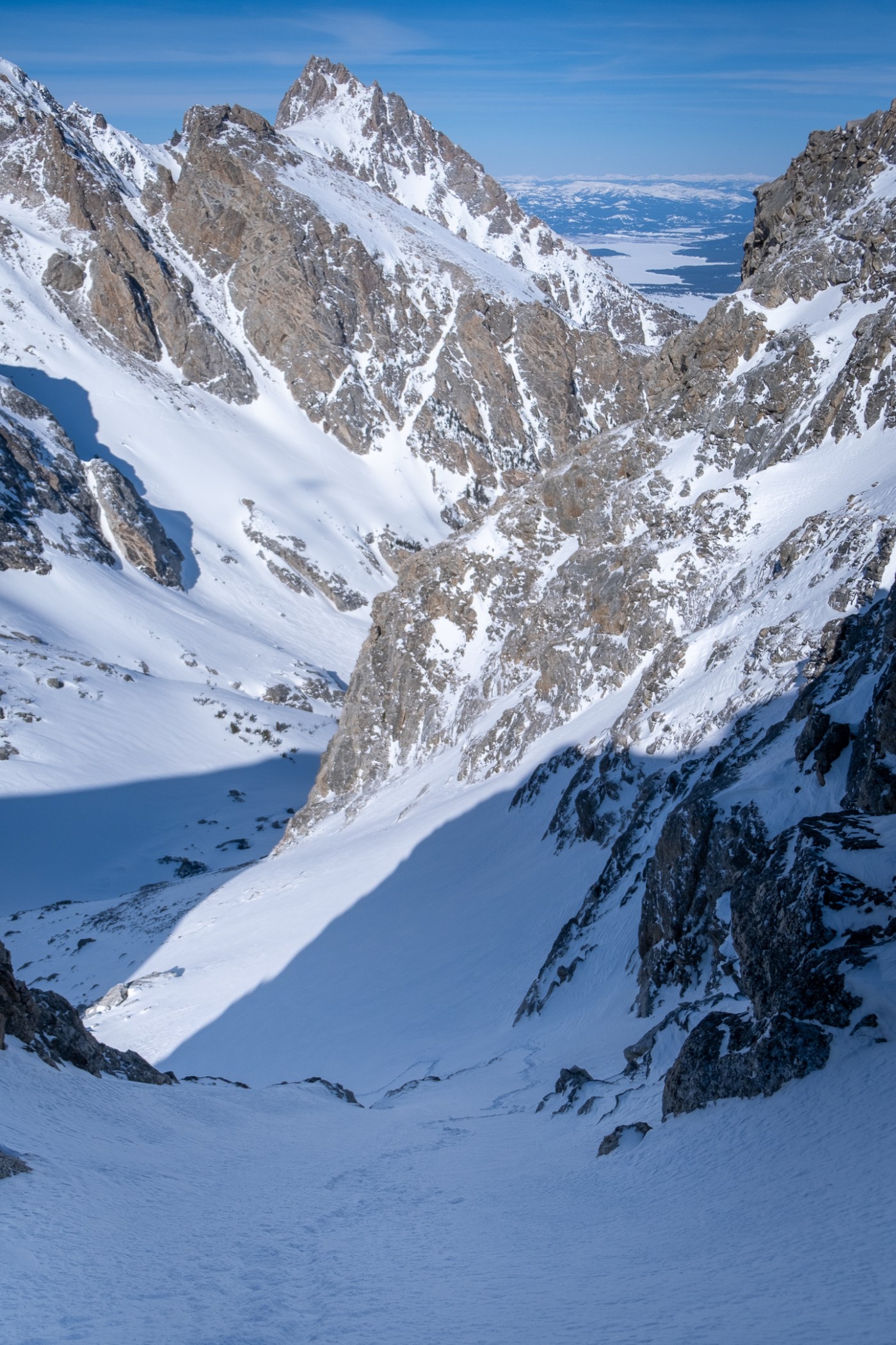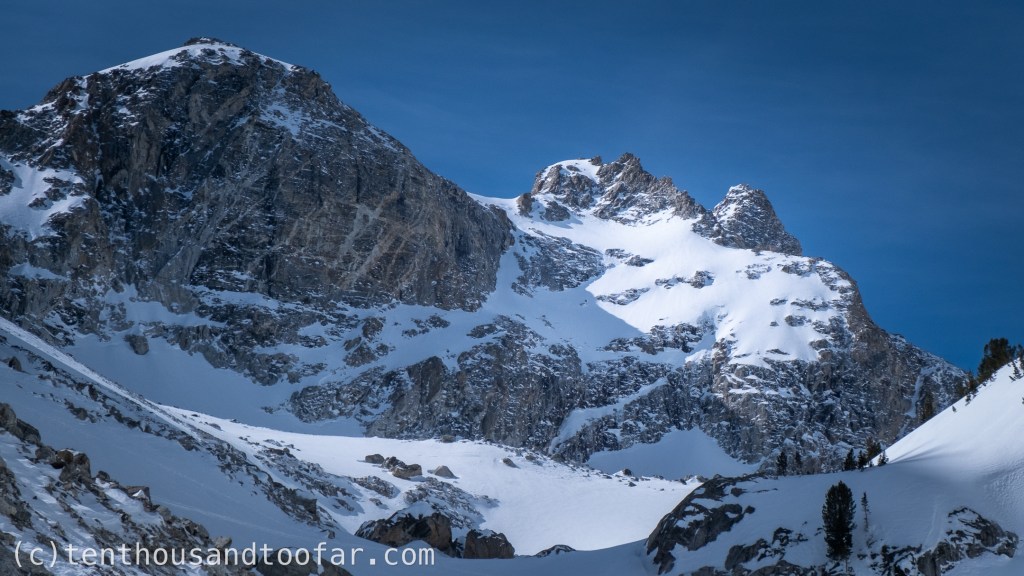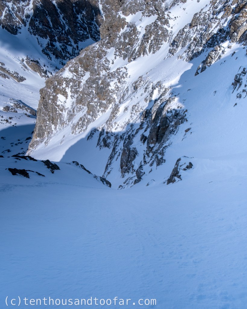 The Overlooked Couloir is the lower NW Couloir on Nez Perce, topping out a few hundred feet above the East/West Hourglass’s and sporting a sustained 50 degree slope for over 400 feet, above a cliff with a low crux – no falls accepted – an interesting consolation prize, and first personal descent, in the South Fork of Garnet Canyon.