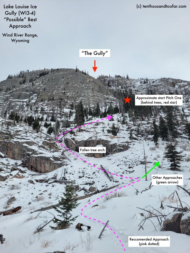 With updated knowledge, climbing skill and savvy, Liam and I shaved four-some hours off Connor James and I’s March 2022 outing. On retreat we found possibly the best approach/descent beta which I will share in an attached picture. The Lake Louise Ice Gully still remains the gold standard NW Wyoming moderate, a four star outing in nothing less than a world class setting. Kuddos to Liam for throwing down a commendable first lead!