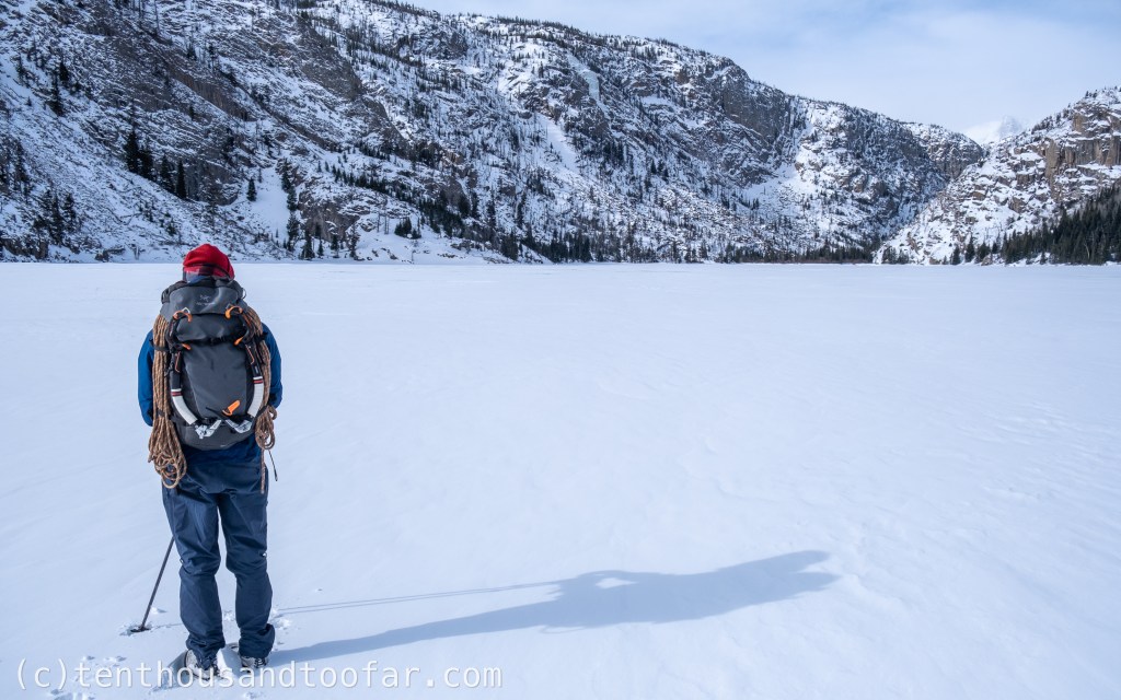 Considering I have climbed The Gully before, we’ll adjust this article for redundancy. In typical Lake Louise fashion, the drive from Teton Valley was longer than expected, but despite heavy storms of days’ past, there was little accumulation on the road. Temperatures were in the single digits, and with a cold down-canyon wind the air felt bone chilling. We left home at 5:10AM hit the trail around 8:00. The approach to the lake was the same three miles of rolling trail obscured in six inches of low density snow. Birds were chirping – spring in the air – but as soon as we reached the alpine cirque home to our route du’ jour and Golden Tiers, moods shifted back towards winter.