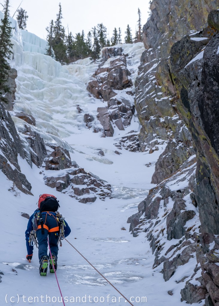 Pitch two was completely plastered with new snow – hardly any ice visible – but since we had the ropes out we decided to simul-climb instead of coiling and re-flaking the line. Liam sprinted the rope 60M before I unclipped and provided a running belay. He continued through the third pitch, and looked remarkably comfortable on the bulgy and brittle WI3- terrain. For a first lead, 60 full meters, with only 9 screws, I was beyond impressed. He took the line of general least resistance, reached the middle grove of trees with style and belayed me up in expedient fashion. This pitch is the meat and potatoes of the climb – about as perfect as it gets for a first ice lead, or experienced glory romp, in the high alpine.