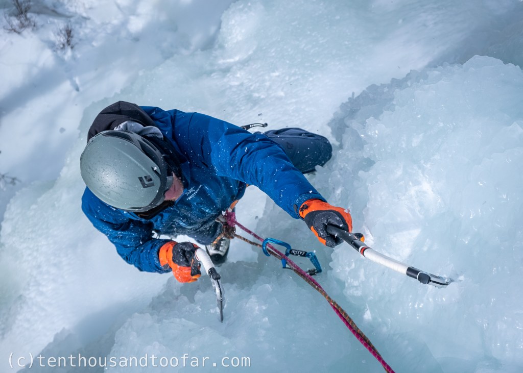 I have been working a lot recently and feeling cumulative fatigue in the mountains, especially sans skis. Frankly, I thought my ice season was all but over, until pow-pocalypse returned to the Tetons and postponed my spring skiing dreams. Neither high avalanche danger nor low angle pow are my scene – so here I am, with tools in my hands like it’s December again. I was excited to be out with Liam, who only recently went ice climbing for his first time, threw down the big bucks on a full kit and was eager to learn the dark arts. In classic crusher style he was interested in in leading too, on only the second ice climb of his life!