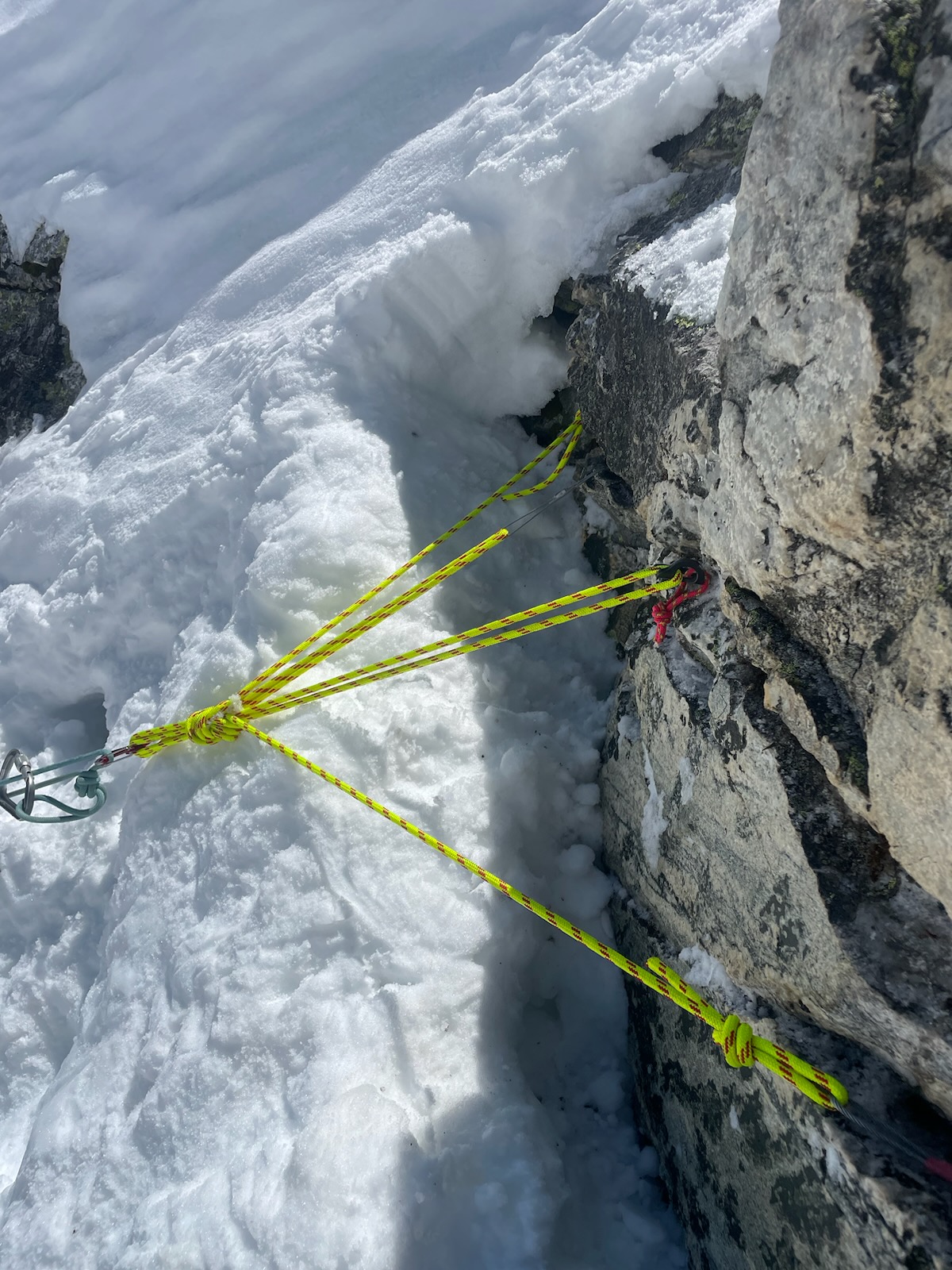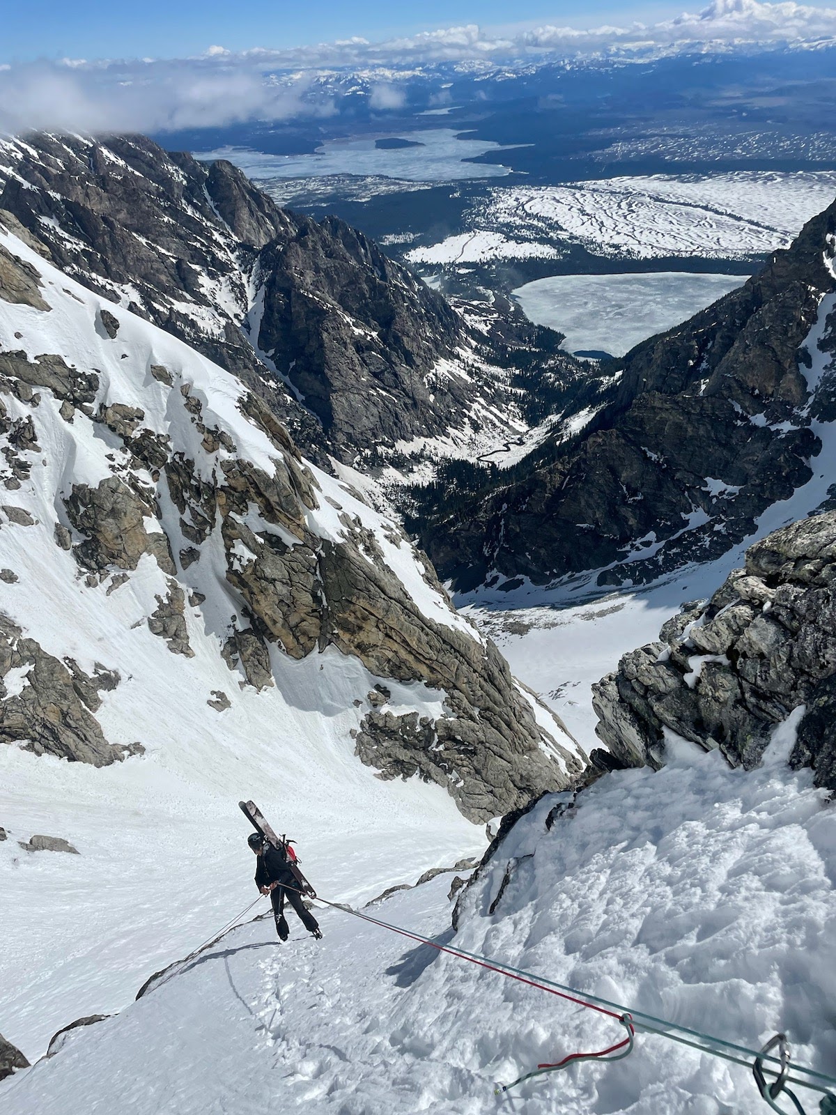Skiing the Northeast Snowfields was a transcendent experience. For five years I’ve had the iconic descent on a pedestal, something I longed so deeply for yet needed to respect, and build towards. I attempted the beast nearly one month earlier, retreating from the top of the line as foul weather moved in. That day I remember questioning whether we could’ve skied, whether we really needed to bail because of low visibility and a little wind. With 20/20 hindsight I can now say for certain the Northeast Snowfields demand optimal conditions, and a first descent amidst a whiteout would be ill-advised. Weaving the cliffs might look simple on paper, but in person the puzzle becomes more convoluted, a pinch harder to decipher. Our inability to find a fixed anchor makes me assume it was lower and covered in snow, highlighting the necessity of self sufficiency. If someone is to stumble upon our anchor it’s worth noting that some of the gear placements are marginal and could benefit from reinforcement or replacement, though that could be said about many of the popular anchors across the Teton Range. All in all, the Northeast Snowfields was a tremendous benchmark experience for this young ski-mountaineer. Making rhythmic jump turns while weaving the terraced cliffs on one of the most commanding north faces of North America is an experience I am not soon to forget, and one I feel especially grateful to have experienced with a partner as grateful, and talented, as Vinny.