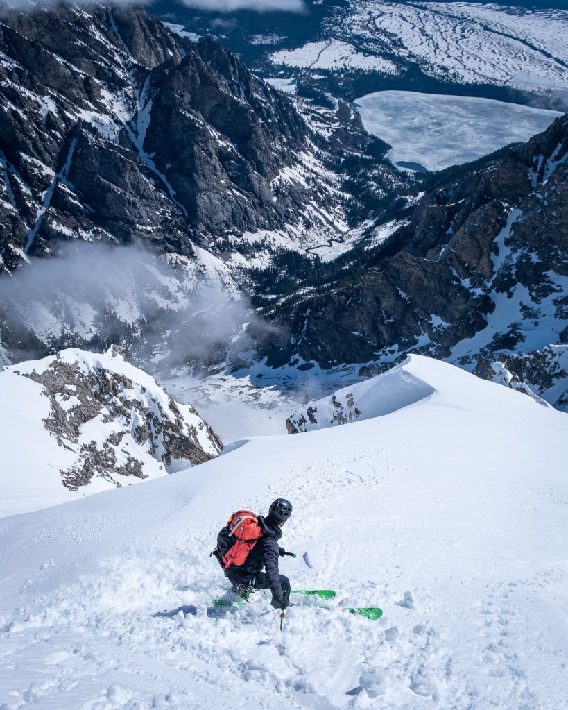 The northeast aspect of Mount Owen is complex, providing a lot more variables then your typical plug-and-chug Teton couloir ski descent. Though the face in general faces northeast, skier’s right faces nearly due north, and skier’s left pure east, if not slightly southeast. In this gargantuan amphitheater of cliffs and spires, nearly 800 feet wide, hang-fire potential is abundant, though the fall-line is relatively well defined, funneling through the crux 200 foot cliff and a 30 foot wide ski-through constriction just beneath. With faces just beginning to receive unfiltered sun we stuck well skier’s right, avoiding the debris in the central face and enjoying 10-14 inches of supportable medium-density May powder. Vinny took the first pitch off the top, which provides the steepest turns, eventually cutting left through the first major cliff band and hooking back right. I leapfrogged through for the second pitch, dancing far right into vigilante terrain, some of the most magical and airy jump turns of my life, arcing back left into the main face and eventually back right onto a well defined rib with a good island of safety. We regrouped here, 150 feet above the crux, and briefly discussed anchor location before I, as the piton bearer, crept my way towards the edge.