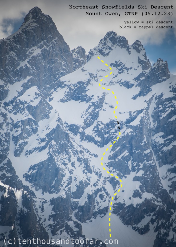 It would be hard not to ramble ad libitum about the Northeast Snowfields. Viewed from South Jenny Lake, the striking northeast face of Mount Owen stands as one of the most visually impressive and equally intimidating ski descents in the range. Beginning from just below the summit block, a ski descent involves connecting a myriad of snow patches while weaving between and above cliffs galore – a puzzle of sorts. The optimal descent via the traditional route will require only one double rope rappel, through a 200 foot cliff reached after skiing 1,000 feet of 40 to 50+ degree “no-fall” terrain. More rappels have been needed on the lower snowfields in low snow yeas, but are commonly “ski through” as they were for us. As a rising Teton ski mountaineer accustomed to steep couloir skiing, the Northeast Snowfields represented a quantum leap into technical big mountain face skiing that requires far more than the ability to stick a jump turn above exposure. Route finding, terrain awareness, anchor building proficiency and team efficiency were tested on May 12th, 2023, when Vinny Gwinn and I made our respective first descents on a line I’ve been building towards, and chasing, for many years.