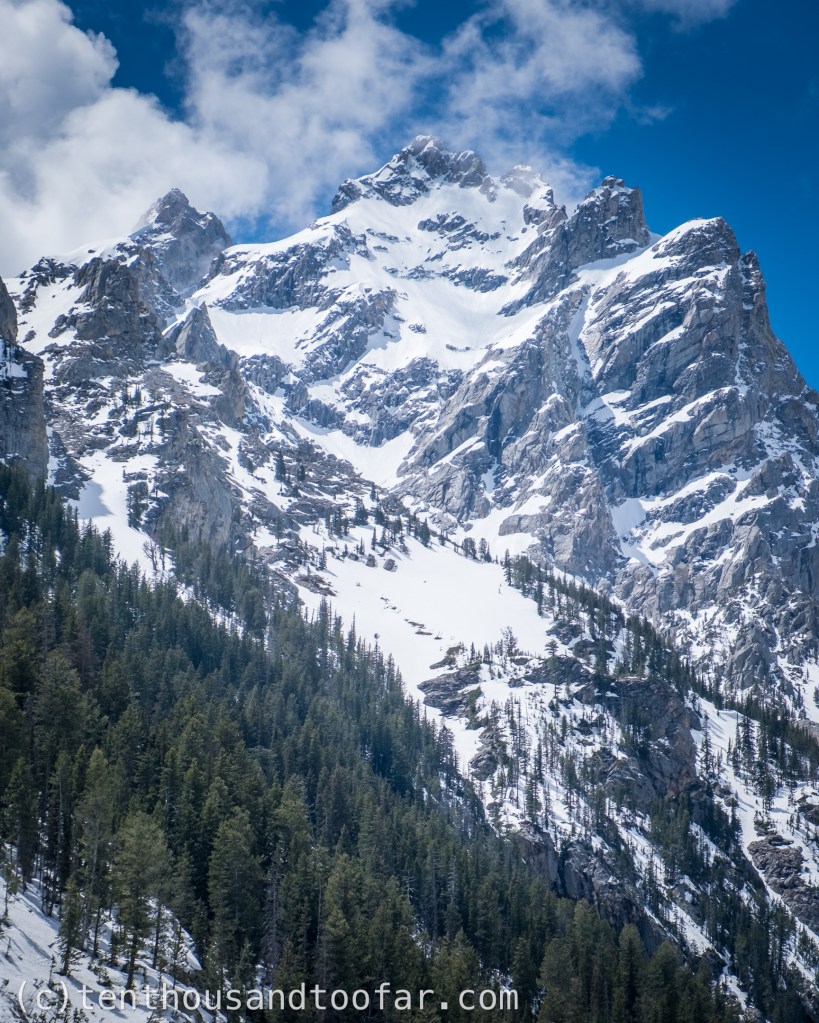 In typical late-spring Teton fashion our day deteriorated quickly upon canyon bottom. Cascade Creek was fully melted, requiring shin deep fording which Vinny dispatched barefooted and I attempted in ski boots wrapped with dry bags – leaving me with wet toes. Several ski-hike-ski changeovers brought us to Jenny Lake, where we walked 2.5 miles through overambitious tourist postholes and puddly summer trail to our rig at the boat dock. All said, the day wrapped up in the vicinity of 14 miles and 7,000 feet of vertical gain, dehydration headaches included.