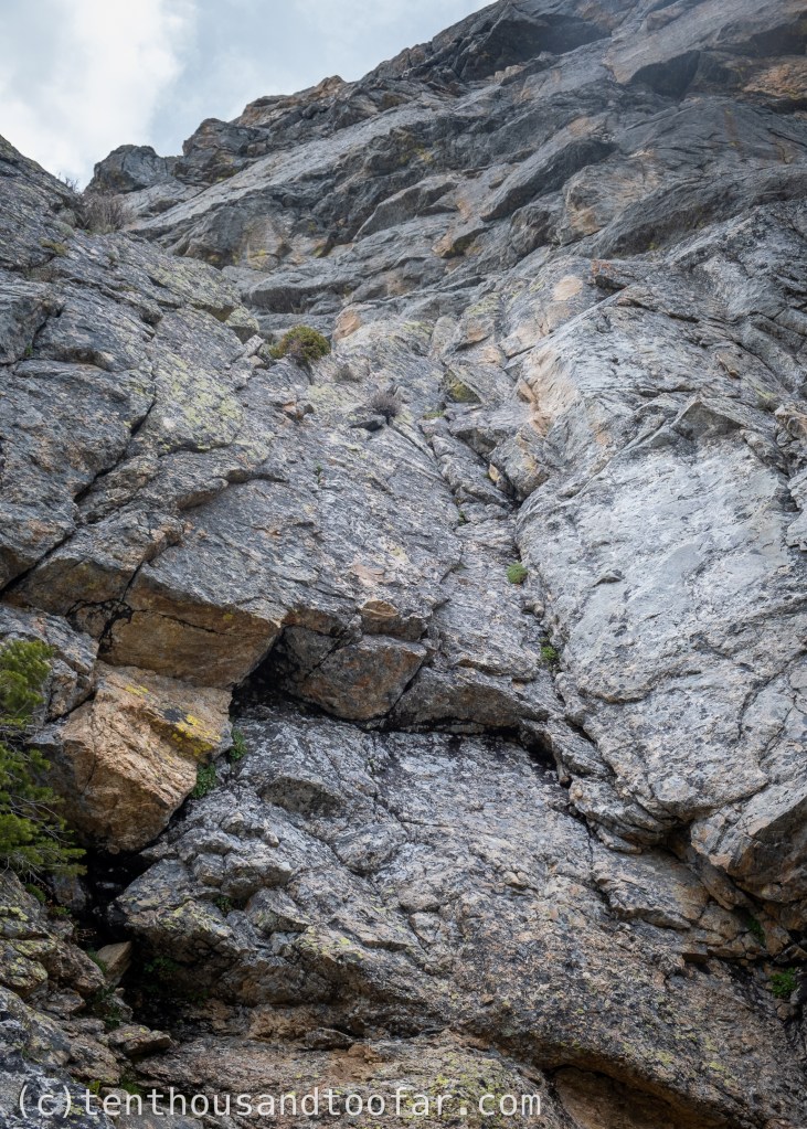 Approach – Walk 0.5 to 0.9 miles past the Baxter’s Pinnacle Social Trail (if coming from String Lake), up Cascade Canyon until the flowing creek relents to a dammed, mostly still, section. Locate the SE Buttress of Tranquility Point and Storm Point. The Entrance Roof can be spotted from the trail. (see first picture). Skirt the lower cliff bands on third class terrain to the east, then hike back west to the base of the fifth class climbing, below and right of the Entrance Roof, which caps the entire first two pitches like an amphitheater. From here the Funky Flake, a boot shaped flake beneath the Entrance Roof, can also be identified. Pitch one begins on orange rock on the right side of amphitheater.