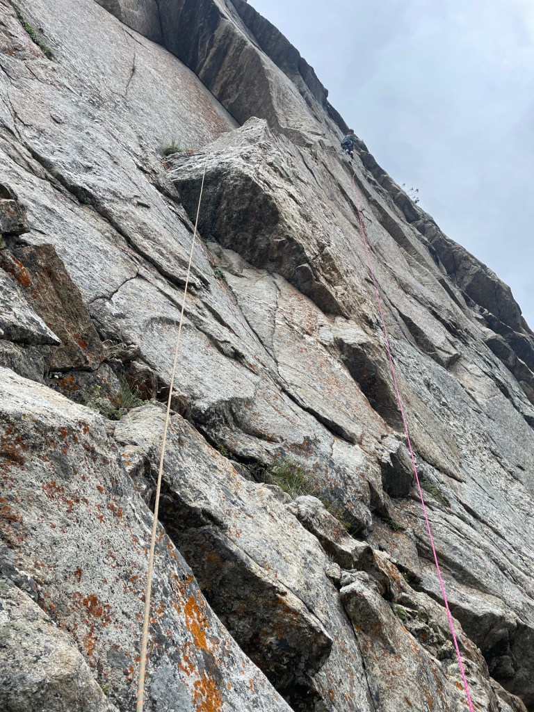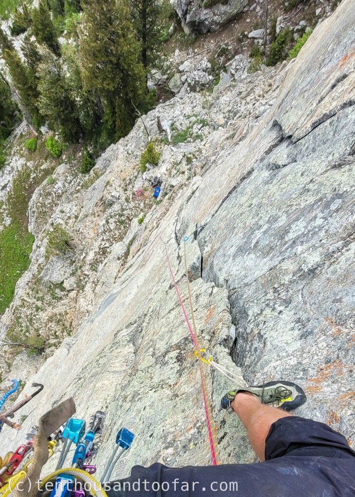 Shared start with Bat Attack Crack, just right of Vieux Guide, about 100M right of Guide’s Wall. A fourth or low-fifth class scramble up and right from where the Guide’s Wall approach trail meets the cliff will be necessary, and a rappel anchor is rigged from this ledge if someone in your party doesn’t feel like down-climbing afterwards. Can be spotted from the Cascade Canyon trail with a keen eye, once identifying the Bat Attack Roof.