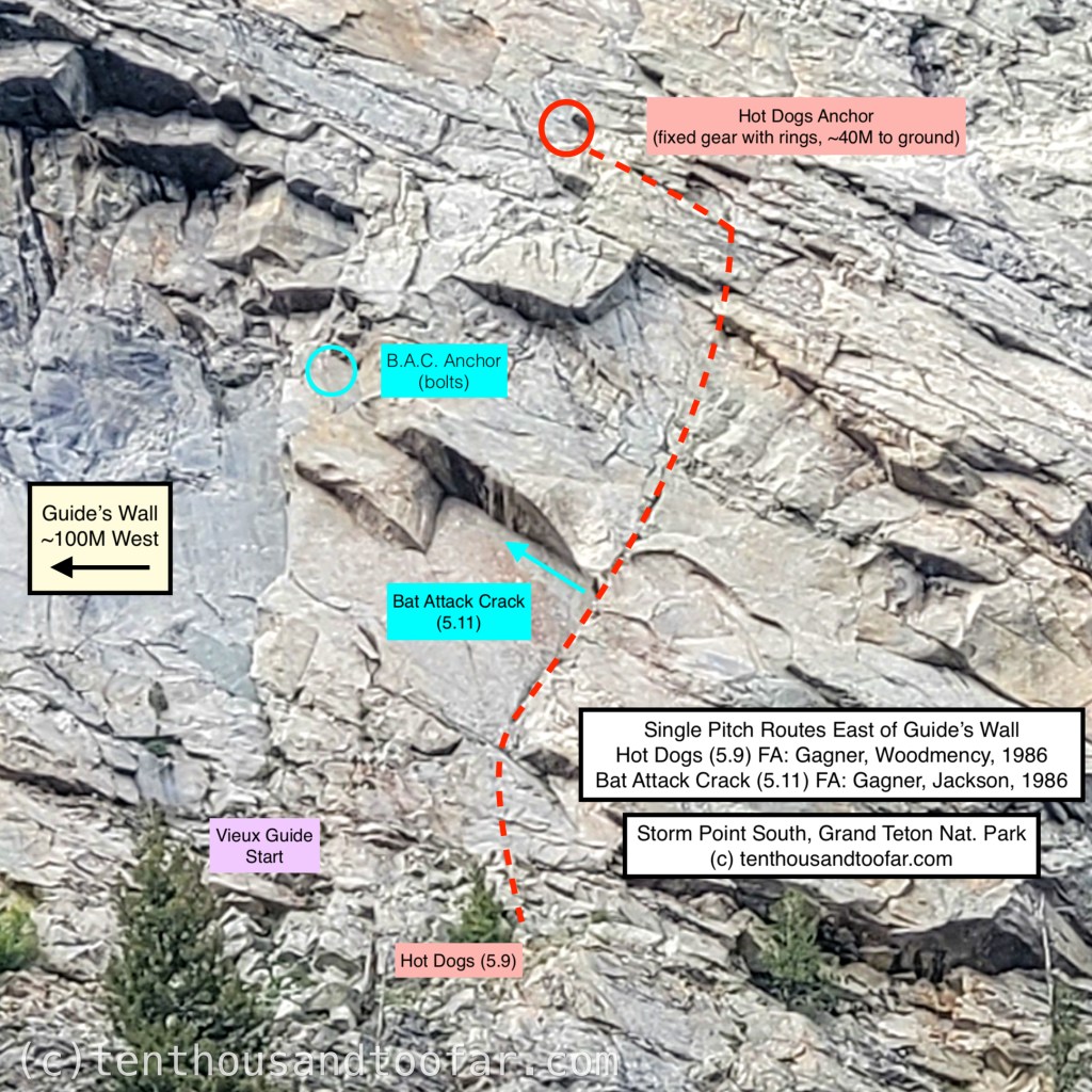Seven days after nailing the first ascent of Bat Attack Crack, Paul Gagner returned with a different partner for the FA of Hot Dogs. This route shares the same start as Bat Attack, but busts out right around the major arching roof following a crack/flake system on excellent granite. A wide variety of movement makes this a great climb, tainted only slightly by a few detached flakes that require restraint. This might be my favorite pitch of 5.9 I’ve climbed in Grand Teton National Park, and would make a sweet addition to a day on Guide’s Wall.