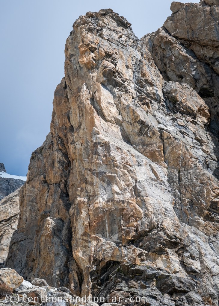 After many weekends of lowland park missions Bobbi and I were excited to launch into the true alpine – to get above the clouds, where the air is thinner, fat marmots abound and rock climbing just feels a bit more adventurous. A heavy snowpack still barred the high peaks so we aimed lower, towards a classic route that has caught my attention many times while thumbing through Aaron Gams’ Teton Rock Climbs – the Corkscrew Arete. Known for solid rock and a straightforward approach, with six pitches up to 5.8+ and incredible positioning on The Watchtower, one of the many freestanding spires between the Grand Teton and Disappointment Peak, “The Corkscrew” seemed a perfect half day plug after cacheing overnight gear in The Meadows for a second outing the following day.