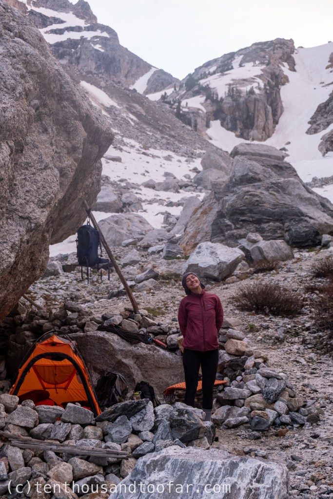 Keeping with the four star nature of the route, the descent was perhaps the coolest I’ve done in the Tetons. From the summit, a precarious ledge system leading to Teepe Glacier seems death defying, until just wide enough mini-sidewalks and nice handholds for balance facilitate a truly memorable, unlikely, highly exposed, yet reasonable goat path off the mountain’s north side – no ropes necessary. With seemingly steady weather we took a leisurely lunch break and paid for it by evening, when a nasty thunderstorm ripped through the canyon and forced a sloppy wet jog back to basecamp. As we stripped off wet clothes and huddled in our sturdy four season Nemo Tenshi two-person tent, smiles of gratitude adorned our faces. As beginner climbers used to prolonged ascents and tedious retreats, today was a welcomed reprieve. The Corkscrew may have been our most seamless and efficient alpine climb as a partnership, on some of the best Teton rock to boot!