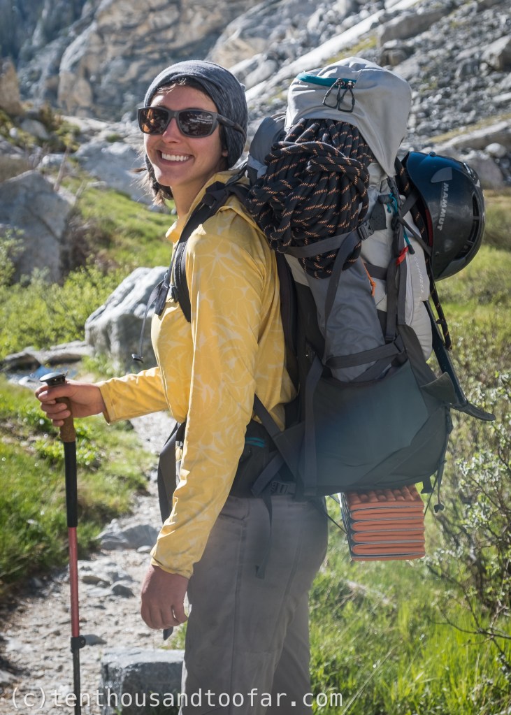 I appreciated a full double rack of cams to from fingers to three inches, a single set of micro cams and a full set of nuts for linking pitches. The guidebook will tell you to bring a #4, but it’s definitely not necessary. I brought one and placed it only once, just above a great #3. The starting and finishing pitches wander a bit, so ample runners are useful. A 60 meter rope is the minimum to link pitches without simul climbing. If trimming the rack, consider double sets of cams from 1-3 inches the most important. No fixed gear was observed on route, and backpacks will not be your friend on pitch five. If climbing with a pack, consider tagging it up after the leader finishes the chimney unencumbered.