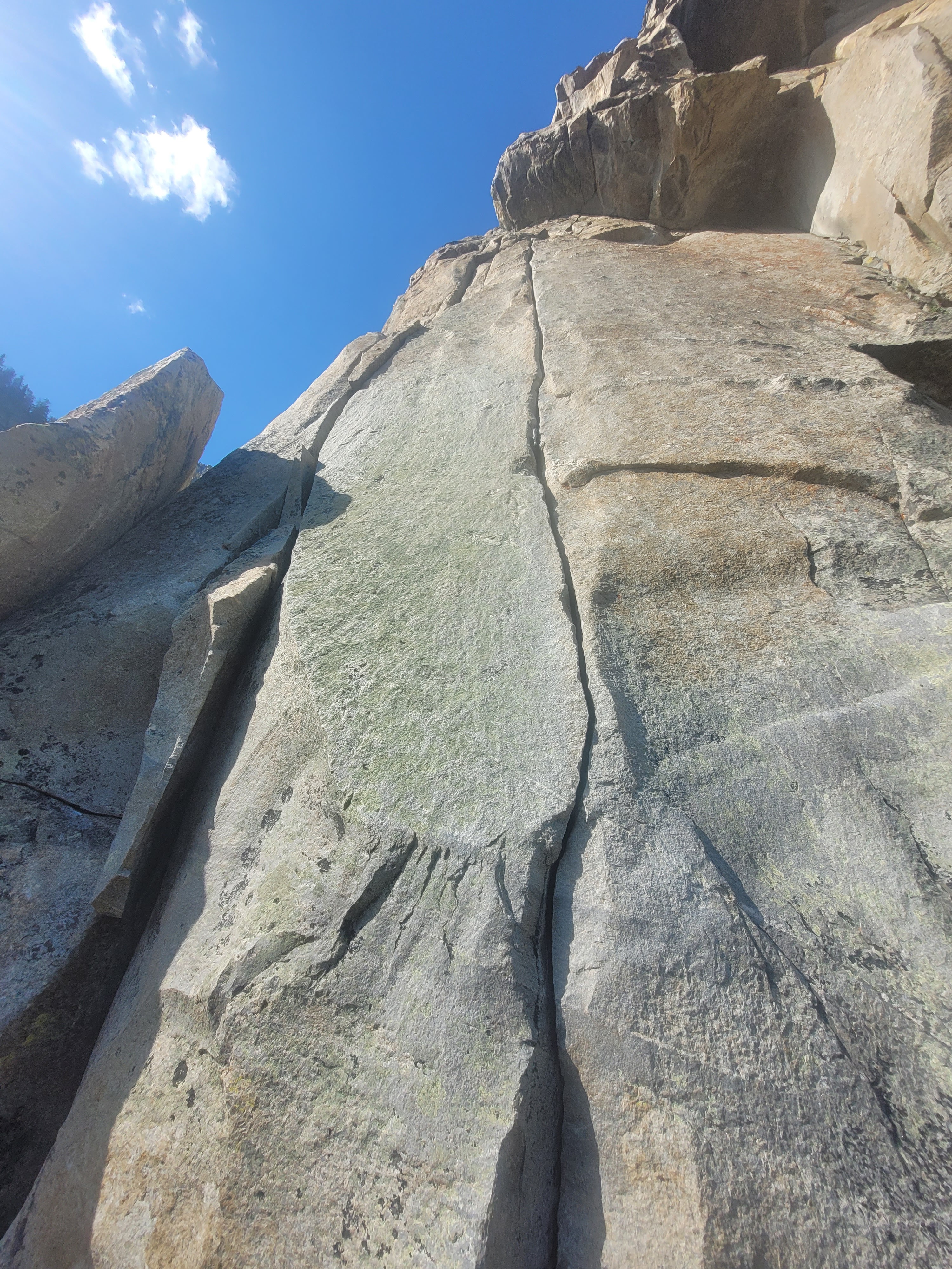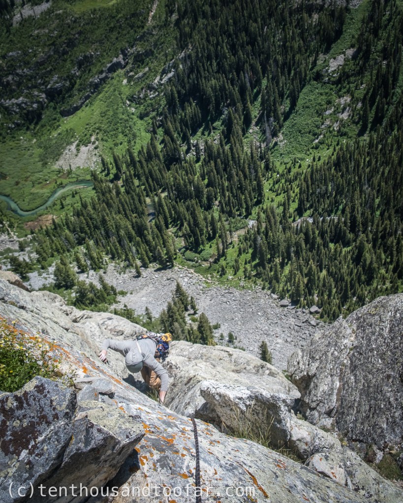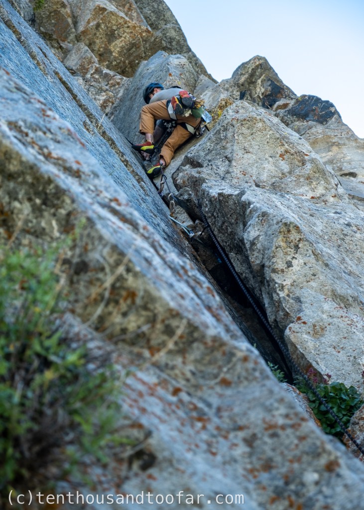 The first three-quarters of pitch five is the other gem of Vieux Guide, which can be reached, and is mostly commonly climbed, from Guide’s Wall. This pitch begins twenty feet right of the original Guide’s Wall 5.7 wide crack, taking an attractive golden 5.9 hand-crack reminiscent of the City Of Rocks. This is about as close to a splitter as I’ve seen in the Teton alpine, and was a difficult on-sight for me. The crack terminates in a mega dead-horizontal roof split by an eerie finger crack. The FA of Vieux Guide took the crack and pulled the roof, though most parties that climb this pitch easily hand traverse back left to the final pitch of Guide’s Wall. The roof felt about 5.11 to me, but Liam confirmed I’m just weak and is likely closer to 5.10b/c. Monster holds adorn the lip yet sadly face inconvenient directions, and took two tries from both of us to lead free (we set an anchor above the roof and both led the pitch). After pulling the roof the crack suddenly dead ends, requiring a semi-hanging belay followed by an unprotected 5.7-ish traverse left to the final, super classic, sixth pitch of Guide’s Wall. In my opinion, this strange roof-crack boulder problem to dead-end slab should be forgotten, as it detracts from the flow of an otherwise excellent 5.9 hand-crack that can be linked seamlessly into the final 5.8 finger crack with a 60M rope. That said, if one does decide to try the roof pull, your smallest micro-cams will be especially useful.
