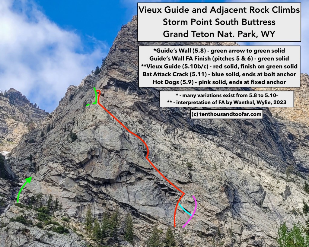 On July 16th Liam Wylie and I climbed Vieux Guide, a five pitch alternative to the ever popular Guide’s Wall on the South Buttress of Storm Point, established by Yvon Chouinard and Jim Donini on July 22, 1980. I’d been eyeing Vieux for a while, hoping to find another nice short approach Cascade moderate for the busier days. Unfortunately, what we churned up was one pitch of excellent rock climbing spoiled by a desperate, contrived, diagonal journey across three pitches of dirty and often loose stone. The fifth pitch, which can also be climbed from the standard Guide’s Wall, featured an excellent hand-crack capped by an awkward and unnecessary dead-end roof pull, which can easily be avoided by a logical traverse left. Vieux Guide certainly supplies value to modern Teton climbing, but perhaps only if segmented into pieces.