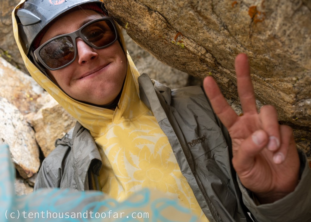 Pitch five has three variations – a beautiful looking 5.9+ layback on the arete proper, a 5.8 fist crack down and east, and a 5.7 step across even further down and east, with the latter two leading to a low angle face east of the crest. Pitch four ends at a small gendarme with a fixed block anchor, where a short rappel or down-climb east of the crest into a vegetated notch with a lone tree facilitates access the easier variants. We took the path of first ascent and least resistance, beginning about 15M below the tree, surmounting a steep step and arcing onto the east face via a short 5.7 crack and traverse. Around the corner, a brilliant slab of prehistoric alligator skin provided an excellent romp towards the crest with gentle 5.5 climbing reminiscent of the Boulder Flatirons. Bobbi raced up and met me at a lone tree on the crest, where I soloed the final pitch of easy slab to an obvious notch leading left of a final tower, pulling the rope through for a terrain belay right as driving rain began its onslaught. A cramped yet convenient cave with some nice insulating dirt provided lovely shelter as the clock struck four, and thunder began to echo amidst dark skies. We couldn’t help thinking about all the other parties on route, and where they might be, while also rejoicing in the fact we were feasibly safe and just raced up a grade-three classic in some three hours and change – truly exhilarating.