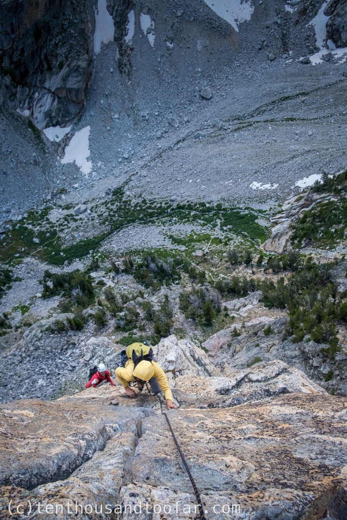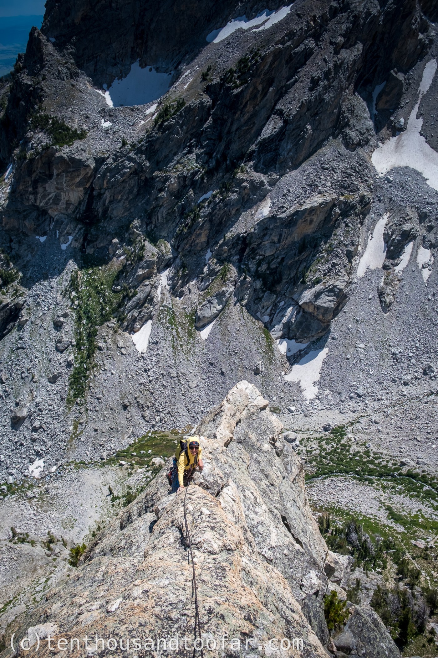 Irene’s Arete is widely stated as the finest rock climb in Grand Teton National Park. Many variations are possible, but we sought the path of least resistance and cleared the ridge at 5.8, with truly remarkable positioning on a golden, awe inspiring knife’s edge arete. Yep, she’s a classic – but, THE classic? Oh, and we hit some traffic too.