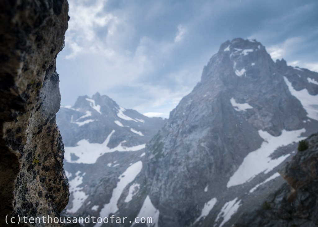 The storm only lasted about 30 minutes, and within the hour we were atop the summit tower (fourth class from the north) enjoying a lovely scene of rain-polished Teton peaks. No lightning was seen, and after talking to several Irene’s parties at various points on the descent it appears everyone made it off the ridge safe, with the only remaining variable a trio of young ambitious bucks from Pocatello that survived the storm but were still leading up the fourth pitch when the final party of the day overlapped. We descended Disappointment Peak via the fourth class Lake Ledges, and enjoyed a brief evening skinny dip in Amphitheater Lake before jogging out to the car at the 13 hour mark. You’d think by August these alpine lakes would get a little warmer, but my attempt at naked aquatic bravery was quickly thwarted by a sheepish yelp at first plunge. Bobbi was only slightly tougher. We live a special life.