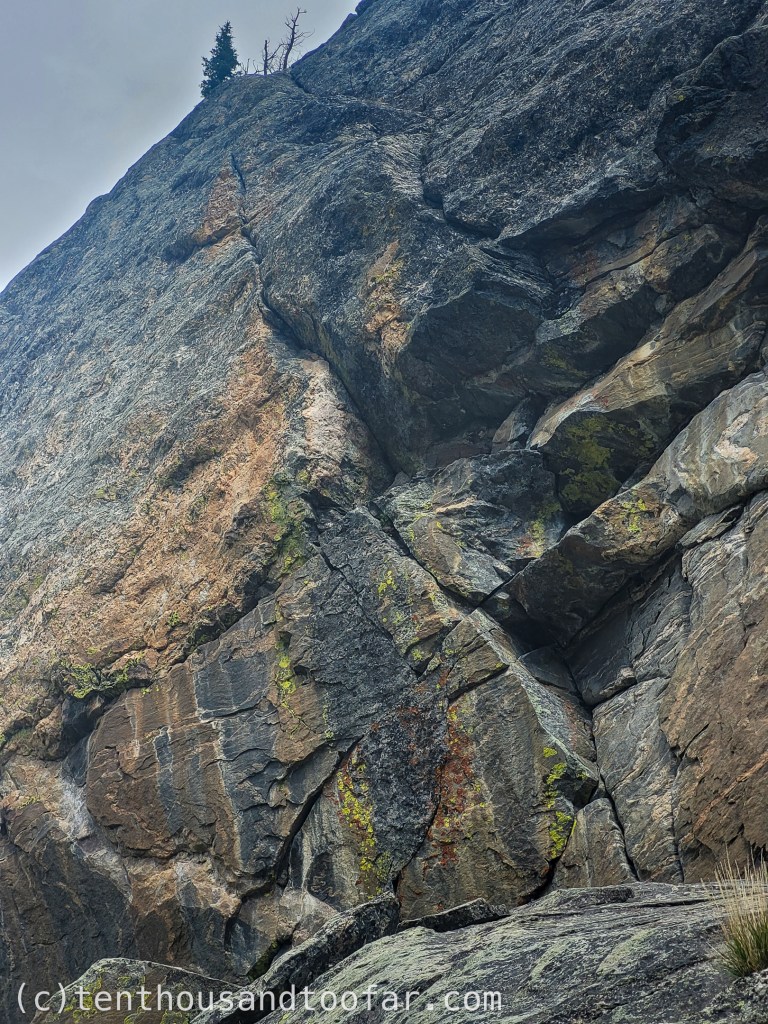 Pitch Two* (5.7, 5.6R, 30M) – Continue up and right above the belay, and step right around the prow when convenient. A delicate move (5.7) will lead to a mantle and a low angle slab with minimal protection. Belay at the base of the next steepening wall, just right of a large black chimney behind a monster flake. There might be some ratty tat right of the belay to guide the way.