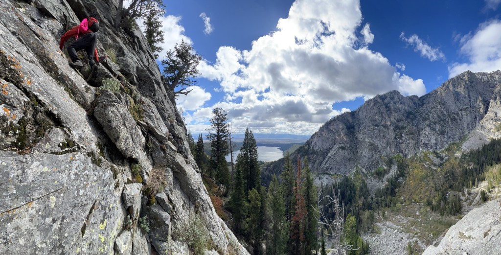 From a back clenching semi-hanging belay above pitch two I continued up pitch three while Connor rested. With many clumps of crimson mini-bushes dotting the steep and subtle dihedral my expectations were quite low, but we pleasantly dusted off a truly stellar 5.9 pitch oscillating between stemming, laybacking and cozy jamming, excellence compounded by wild positioning on a picturesque wall above Phelp’s Lake. Manufactured typically ends at a fixed tree anchor above pitch three, but we forgot the second rope required for descent. Instead, I ran our third pitch past the tree anchor and up a mangy 5.7+ right trending crack to the top of the mysterious black roof home to the Guardian Of Death project (5.13+?), and Connor led one final simul-scramble up 5.5 terrain to a large forested bench topping the buttress. Not only did this provide an excellent vista and satisfying way to end a rock climb, but also facilitated a simple walk-off descent with two single-rope rappels down the gully just west of the Ship’s Prow (see topo above for more descent information). We reached the packs some five hours after tie in, and enjoyed a lovely spread of pinkish sunset colors as we jogged out before dark.