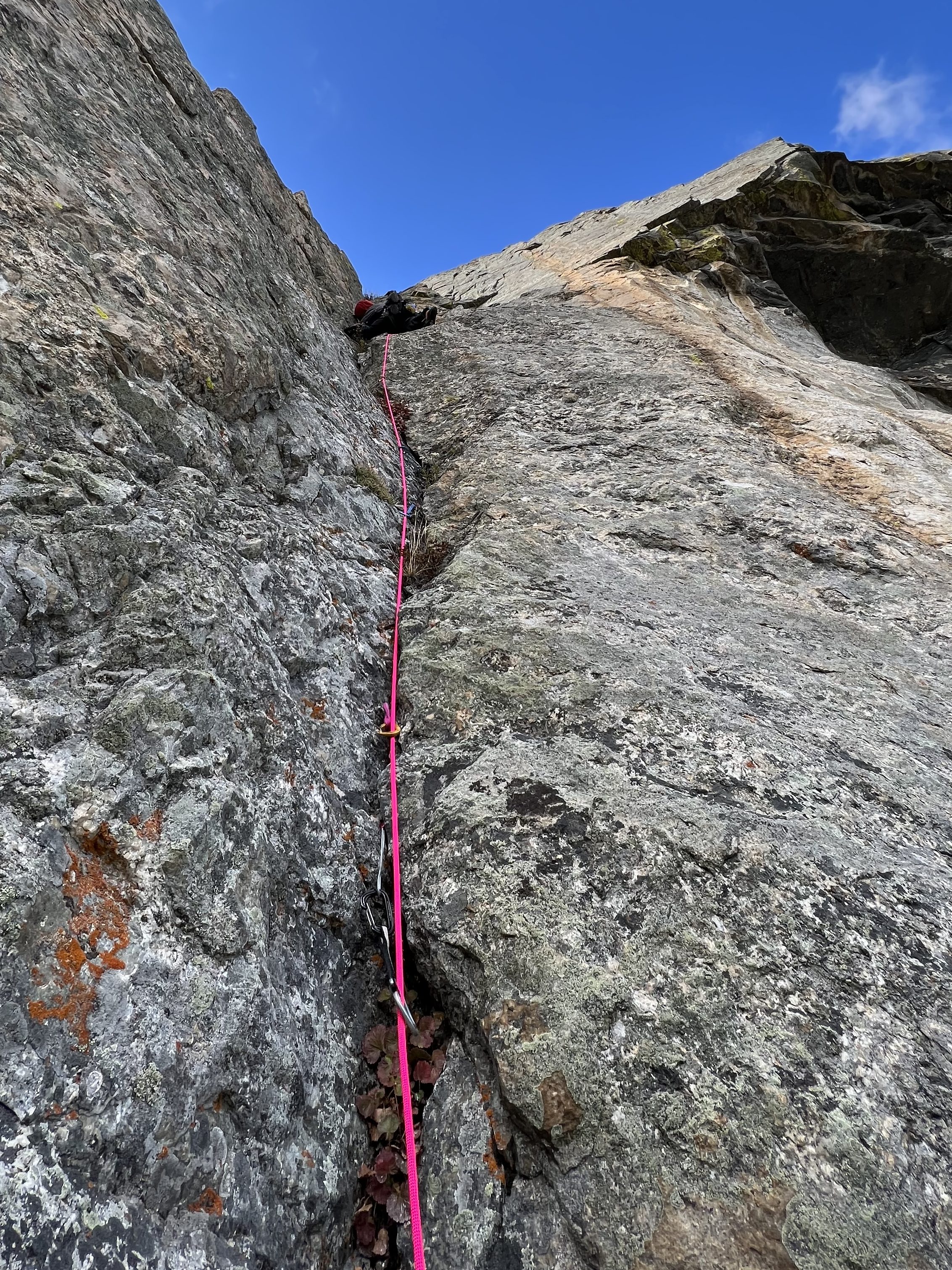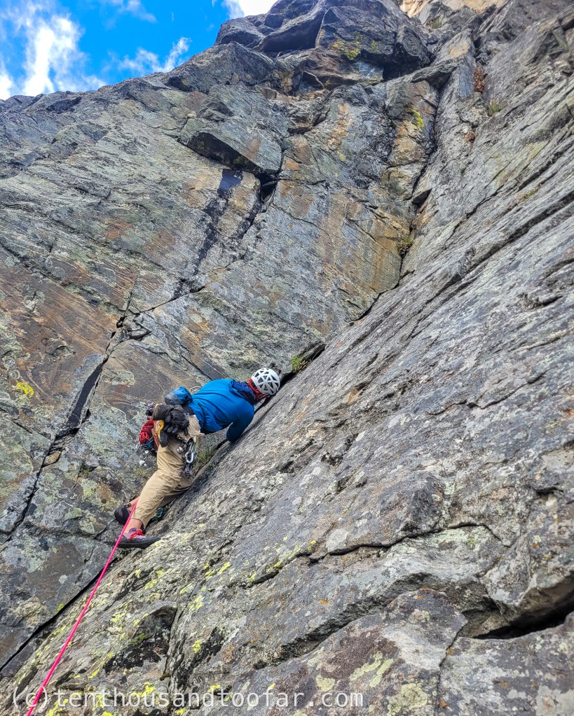 As for Manufactured Crisis in whole, this route has serious four star potential. I suspect the “R” rating on Mountain Project acts as crowd repellant, but in reality this second pitch falls somewhere between PG-13 and R, definitely not unreasonable for the 5.10 trad climber with a sturdy head. While those two FA pitons would’ve been lovely to clip, the biggest run-outs are probably no more than 15-20 feet on sound rock. I felt reasonably safe picking apart this pitch move by move, and think many parties deterred by the danger grade, rather than the difficulty grade, would share my sentiment. That said, there’s definitely a few places on 5.10 terrain where a fall could be shit scary, if not catastrophic. By alpine standards this climb is already acceptably clean, and with some repeats could buff out to a supreme short approach 5.11 outing.