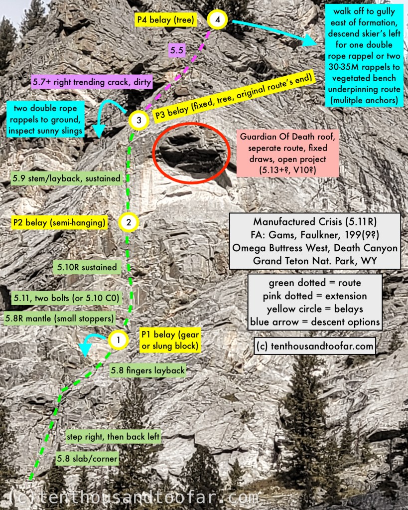Manufactured Crisis, along with Sunshine Daydream and Omega Triangle, stand as the first frontier of 5.11 Death Canyon climbs. Why are we even talking about 5.11 when I haven’t tried Caveat Emptor? Well, Caveat is indeed next on the agenda, but after four days of cold temps and heavy rain the massive south facing columns and dihedrals that compose Cathedral Rock’s south face were surely percolating. On the other hand, Manufactured Crisis ascends a shallow east facing dihedral on a much smaller formation less likely to harbor stubborn moisture, with a two bolt crux that seemed friendly for climbers breaking into the grade, or aid-able in the likely event of failure. After a hard overnight freeze and a cloudy morning we opted to sleep in, setting sail from the Death Canyon lot with hopes of a full-sun experience at 11:00AM.