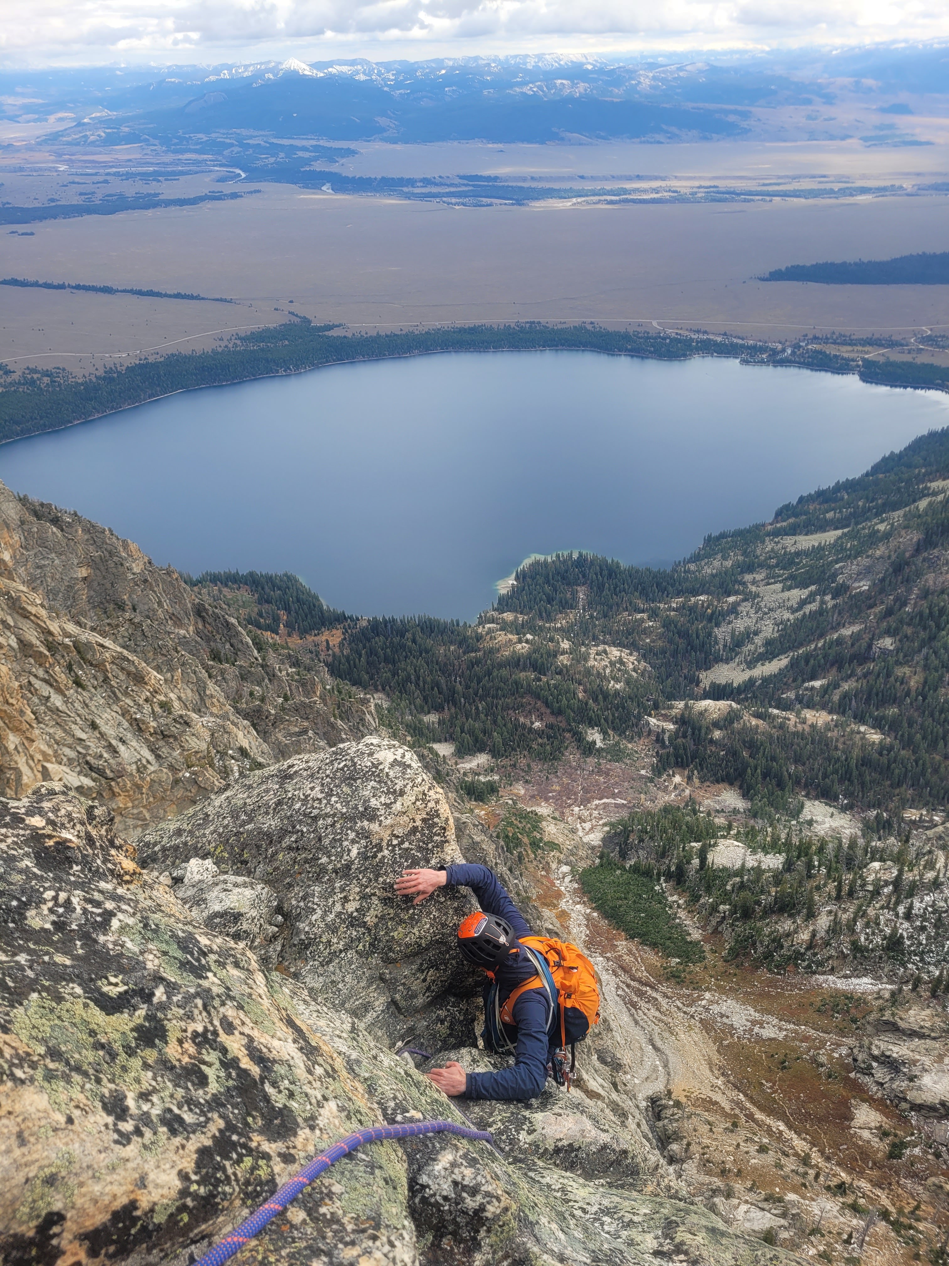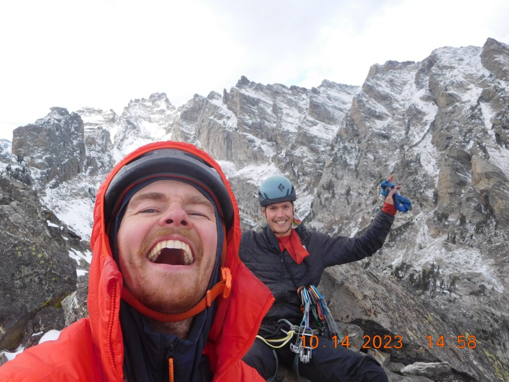 We descended by way of the same Southwest Ridge rappel station Neil and I installed the previous week (see Direct Jensen Ridge for more detail), followed by the traditional rappel into the Southwest Couloir. Unlike last week, the couloir was now wall-to-wall with patchy snow, and the ledges beneath the rappel funneling into the couloir were chocked with anywhere from 6-24 inches of slop. Slow and methodical down climbing over icy steps and chimneys, sans crampons, brought us to a tree for one last rappel into the couloir proper. With every 500 feet lost in elevation the snow halved, and by 9,500 feet we were back on scree, with wet socks and happy souls. The initial inspiration for a late foray into the high alpine was born from dropping my approach shoes off the Direct Jensen and leaving a pair of rappel gloves in the Symmetry Couloir, both of which I hoped to find this day. Sadly, all I recovered was two squirrel desecrated gloves, leaving the true prize of October 14th, 2023, as a smooth salin’ season ender on a classic ridge I cannot wait to repeat in the years to come. The Durrance Ridge marked my 27th complete alpine route in Grand Teton National Park this summer, for a total of 158 pitches and at least 1,000 smiles. Man, do I love climbing in this amazing place. Thank you to all the people that shared a rope, smile and memory the past few months. A separate reflection is soon to come.