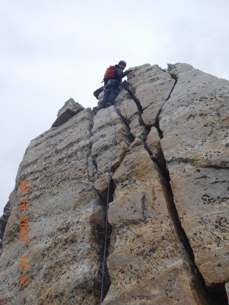 Above the Durrance Ridge we scrambled a few hundred feet to a gendarme impeding passage to the notch rappel station and summit scramble. This tower offered seemingly easier terrain on the east, but an attractive steep double crack system on the crest proper called our name. 30 feet of clean but short lived 5.7+ jamming and compression overtook the tower, from which we traversed to the notch and ultimately soloed the Upper Southwest Ridge. Six days prior Neil Gleichman and I soloed west of the notch rappel, which involved a short-lived but airy 5.6 hand traverse to easier terrain. This time, Scott and I tried steep ledges on the east, which provided an easier but more sustained path, maybe 5.2. The summit was rewarding, but the chilling winds of late fall and extensive snow across the range reminded us winter is indeed coming at any moment, and the descent could be involved.