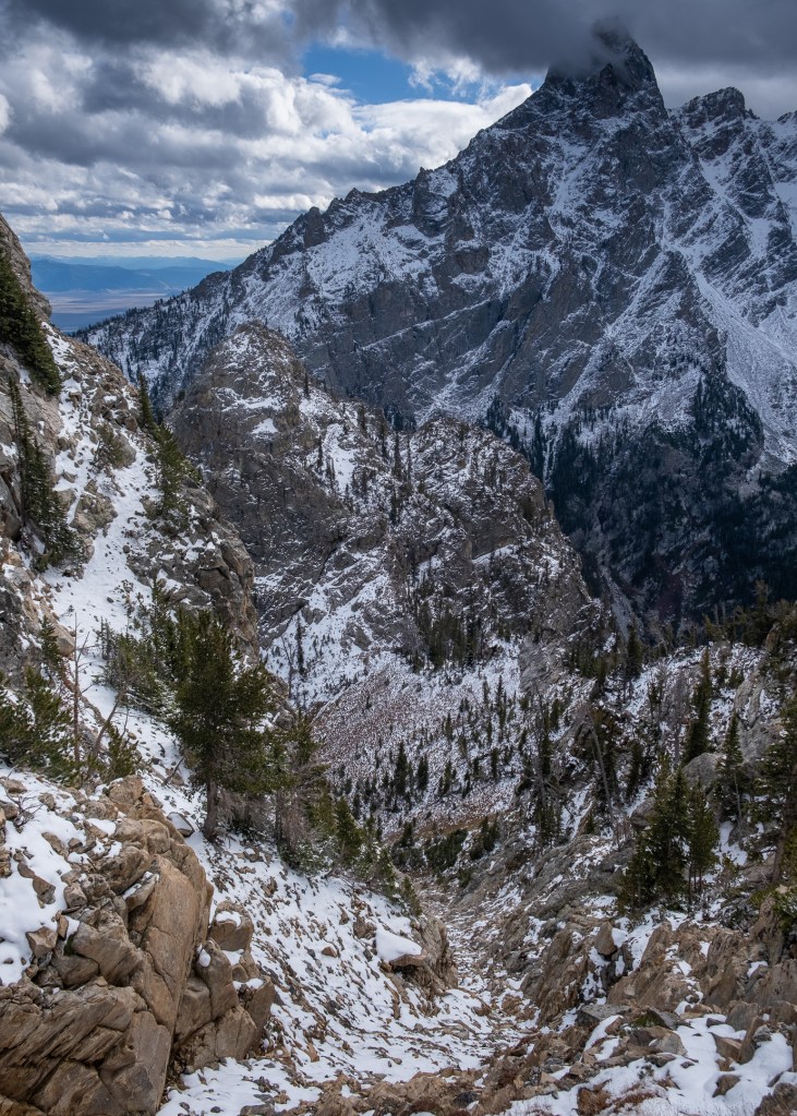 Wow! What a treat. After an adventurous outing on the Direct Jensen Ridge (5.8, III) only six days earlier left emotional scars of rope drag and heady runouts, the Durrance arrived like a warm fuzzy blanket to tuck Teton rock season into hibernation. Never say never, but something tells me alpine rock will be closed for business after this week’s snow and subsequent cold snap. Scott Melin and I climbed the Durrance in an efficient six pitches and final pleasant solo. There was snow on the ledges and even periods of light snow, but the bulk of the day was radiant sun that felt almost like July when the wind wasn’t swirling. The rock on the ridge was primarily that golden bullet Teton granite dreams are made of. After the first pitch, which began just left of the toe of the ridge in an obvious black chimney with two fixed pitons, we back pocketed the topo and climbed the crest, involving many pleasant low-angle crack pitches up to 5.7 interspersed with easy-fifth class rambling. Modern topos seem to suggest intermittent dips left of the crest to avoid certain difficulties, but we didn’t see the need. Our intentions were to climb the 5.8 black dihedral variation to the final pitch listed in the Gams guide, but a snowy ledge traverse barring access and some relevant icicles above the corner nudged us towards the traditional 5.6 corner finish, which was more awkward than expected for the grade with superb positioning on the ridge.