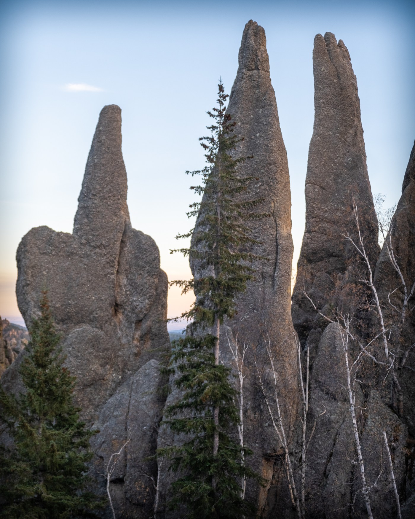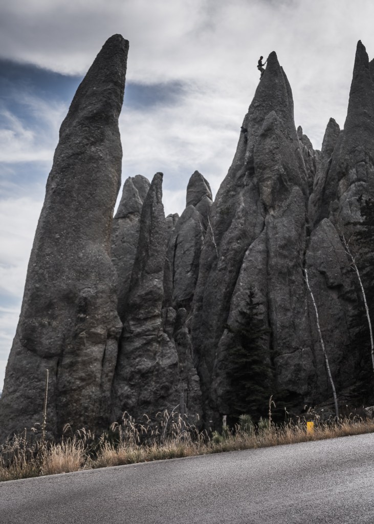 After a day of well protected bolt clipping at Mount Rushmore – what a novelty – we shifted focus towards our main inspiration for driving ten hours to South Dakota other than hanging out with Minnesotan friends Carl Osterburg and Bailey Haus – the South Dakota Needles. The eroded course-grained granite pillars are a popular tourist attraction for many driving the west. Located in Custer State Park and the famous Black Hills, an impressive road winds through tunnels and car-width notches to show all eyes the most interesting of granite formations in the country. This unparalleled access makes approaches virtually non-existent, and every route we climbed was accompanied by astonished tourists snapping pictures, recording home movies and celebrating our summits. Had we been clipping bolts or climbing straightforward cracks `the overbearing attention may have felt more benign, however, there’s few things like tourists asking “what happens if he falls?” while you’re 30 feet runout in a 5.8 stem chimney above a micro-nut in a shallow flare. The Needles have a strong old-school ethic focused on minimal fixed gear, with bolts placed on lead and grave defying run-outs embraced. I had a tick list up to mid-5.10, my typical Teton trad on-sight grade, but quickly checked myself after a wild adventure on Threading the Needle (5.8+ R/X) left me satiated. This was a different varietal of 5.8 than I climb back home. For the pure climbing audience out there, each route will be followed with a recommended rack based on what I’d carry for a second lap.