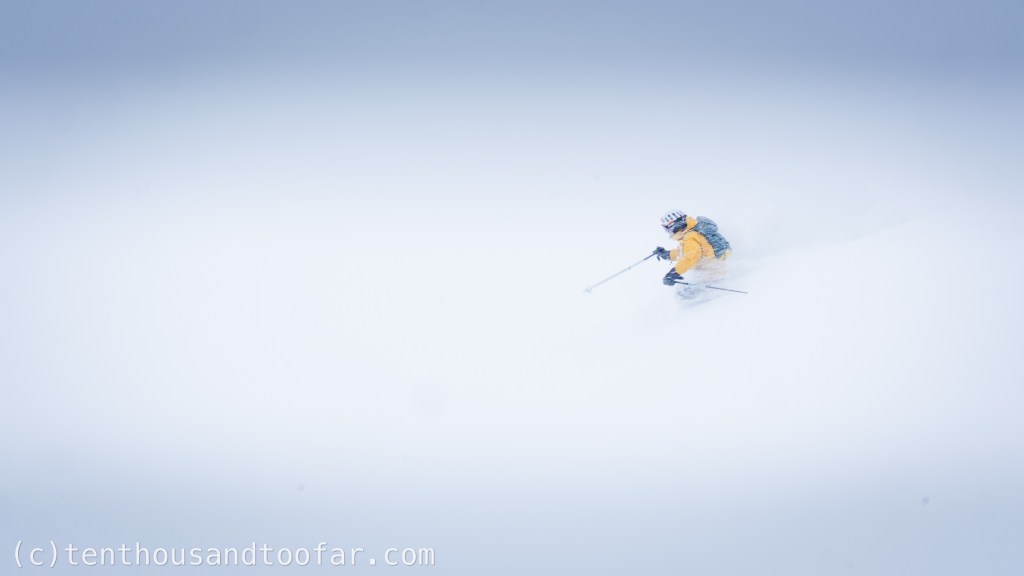With marginal wind effect and VERY low snow density the upper Southwest Bowl provided cold smoke turns on a firm bed surface, a blissful whiteout experience reminiscent of my Lift Operator days at Grand Fog-ghee. After a few hundred feet we cut hard left to avoid getting sucked into the tightening ascent gully and traversed to the Southwest Ridge. We galloped the crest for the remainder of the descent, enjoying endless 25-30 degree gladed terrain that felt like skiing a half-dozen Mail Cabin laps back to back, and nearly bottomless to boot. When the ridge terminated in a dramatic cliff feature around 7,500 feet, we successfully escaped skier’s right down steep trees into lower Elbow Canyon, and were able to billy-goat peacefully to the car with little effort.