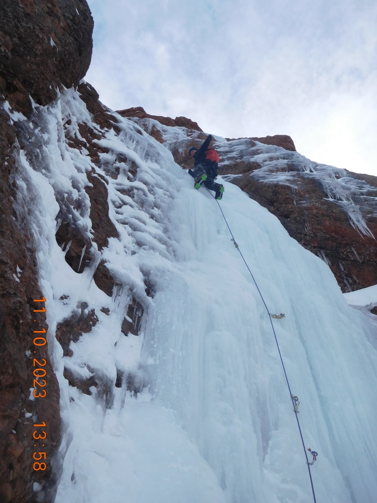 Alongside ice screws to comfort for a full 60M pitch of ice (we brought ten), we made use of thin pitons and a few nuts, both as lead protection when I ran out of screws and for anchoring. A 60M rope is probably the minimum required to climb past all the ice on pitch two without belaying in the firing line. Stubbies might be useful in lean conditions, but ours got placed in thick ice. Winter Dance (out of print) is the only guidebook I know of with the Sphinx routes detailed. The new House Of Hyalite book (2024?) might have a section on the Sphinx.