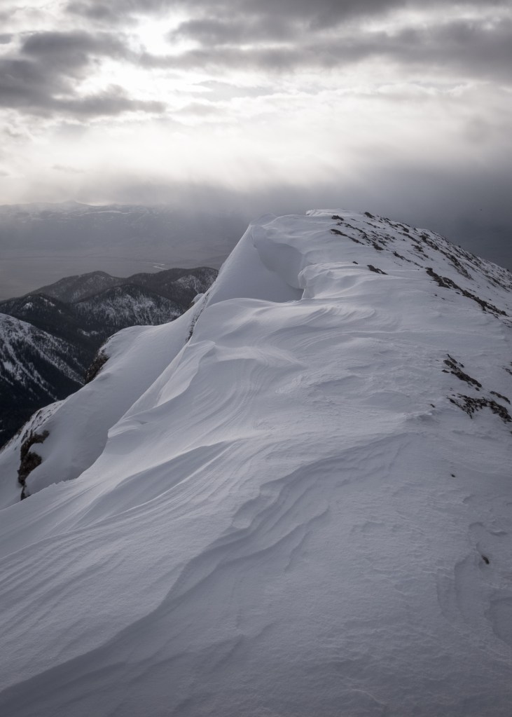 A long couloir of approximately two more rope-lengths led to the summit ridge, with four separate lumps of easy ice separated by crusty snow. We micro-traxion simul-climbed out of formality but in hindsight could have easily soloed. From the rope coiling point, 500 feet of jumbled ridge scrambling led to the impressive 10,840 foot summit. A crushing wind and fading daylight kept celebrations short as we made our way down the non-technical Northwest Face to the saddle, moonwalking a marvelous 35 degree powder field that almost had me wishing for skis.
