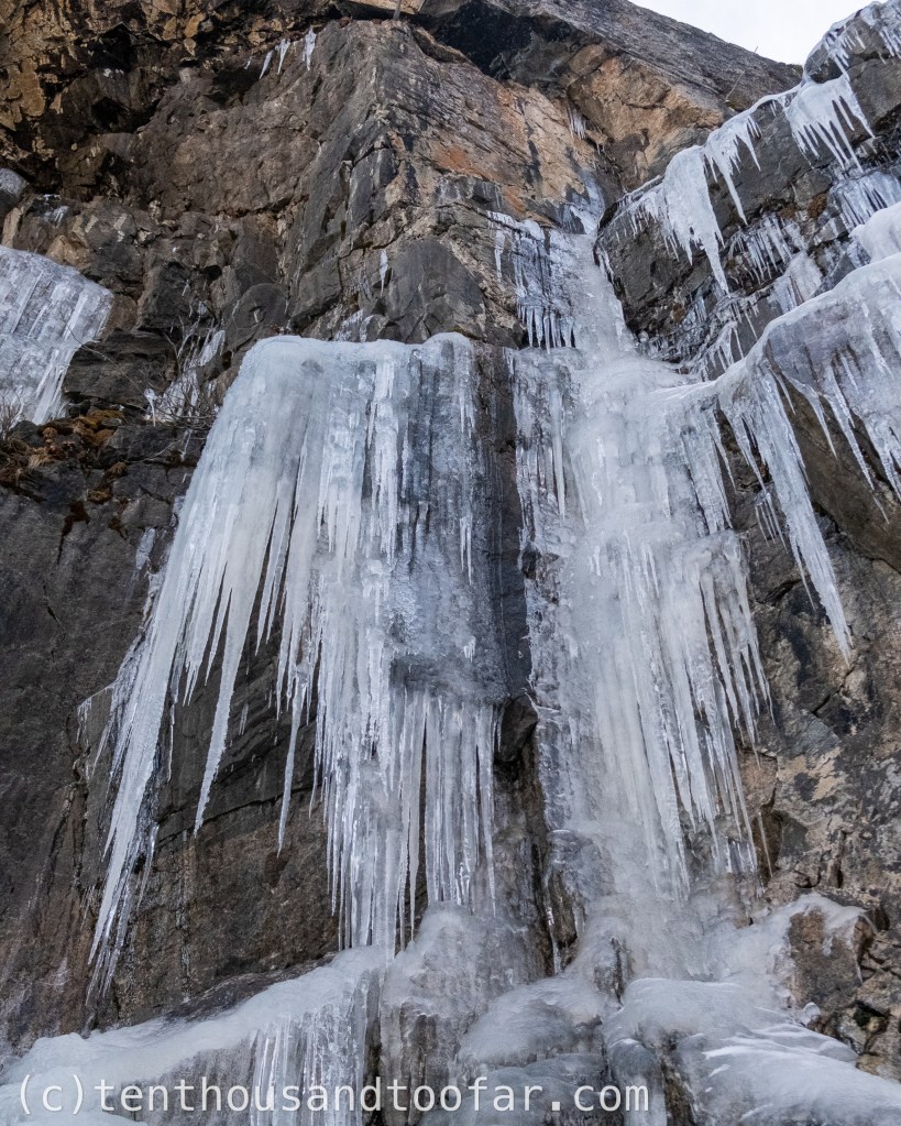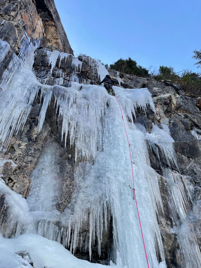 The climb itself was exactly as the book promised, a technical, delicate, candled, vertical adventure with an interesting finish on a body-height mini-pillar in a rock corner. The initial pillar, fortunately well adhered to the rock behind, was strenuous, with lots of exhaustive clearing needed to place reliable protection. The second step “mini pillar” had less inspiring ice, but protected well with a medium sized cam in a horizontal slot. The ice atop the climb was too thin for v-threads, so we donated a rock anchor for abseil and ran three top-rope laps until a healthy pump and setting sun called us towards bicycles.