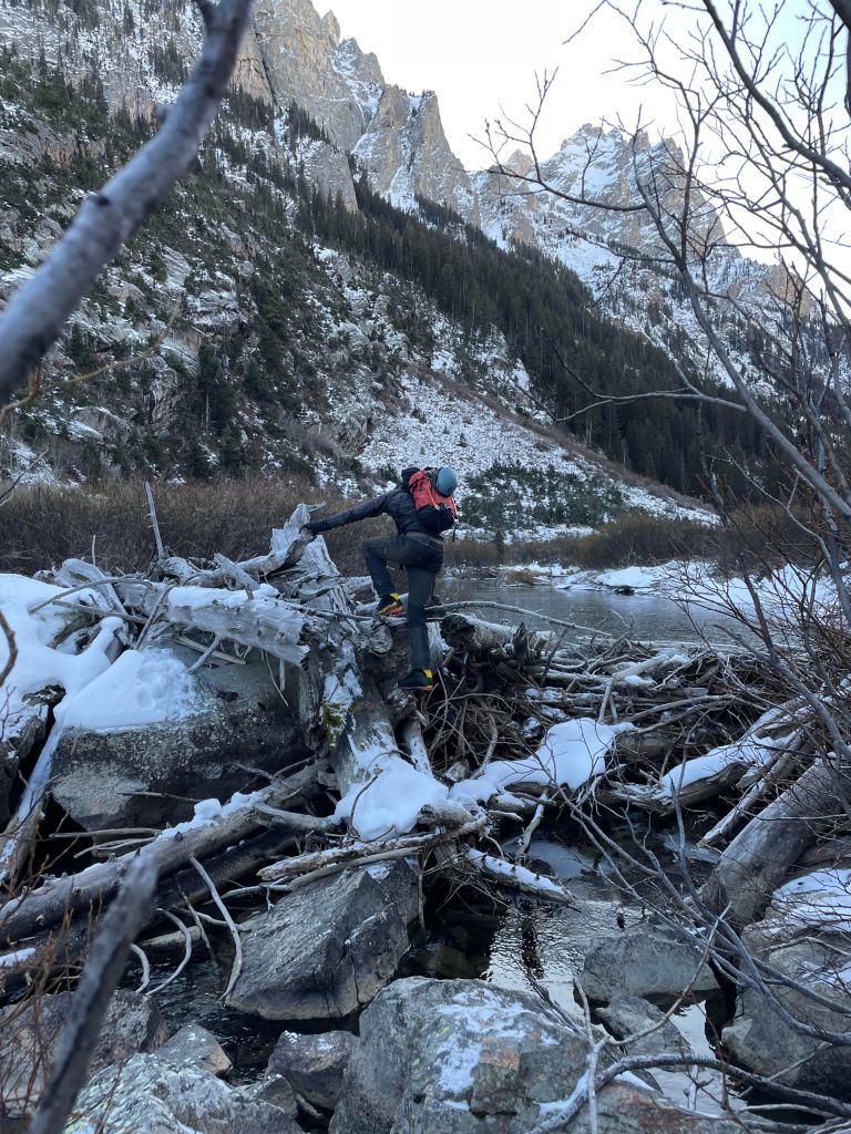 Ice ice baby! After two fruitful yet strenuous trips to the high elevation North Face of Sphinx Mountain, the Northern Rockies’ renowned early season ice venue, I finally got to swing some tools in the ol’ backyard. Vinny Gwynn and I left the Bradley-Taggart trailhead by bicycle around 7:45AM, headed for Jenny Lake and Cascade Canyon. Cascade might have the highest concentration of ice climbs in the range, but once snowbound access becomes a nearly unreasonable eight-ish mile ski. Today we took advantage of a dry park road, knocking off the first five miles with two rubber tires. Three miles of sneaker hiking took us into the gut of Cascade. There are three “climbs” on the initial North Gullies of Teewinot Mountain, aptly named North Gullies “Left”, “Center” and “Right”. The Center and Right lines are eloping rambles of steppy ice early season, steeper and shorter nuggets with the lower pitches mostly buried by winter, between WI2 and WI3 each. The Left is a shorter but significantly more strenuous outing, forming anywhere from a 20 meter technical WI4+ pillar in early season to a buffed out WI3 by mid-winter. Crossing the creek “can be the crux”, as stated in the Teton Ice Guidebook, but we found a convenient beaver dam just west of the climb. 500 feet of willow stricken bushwhacking leads to the base. We arrived about three hours after donning bikes.
