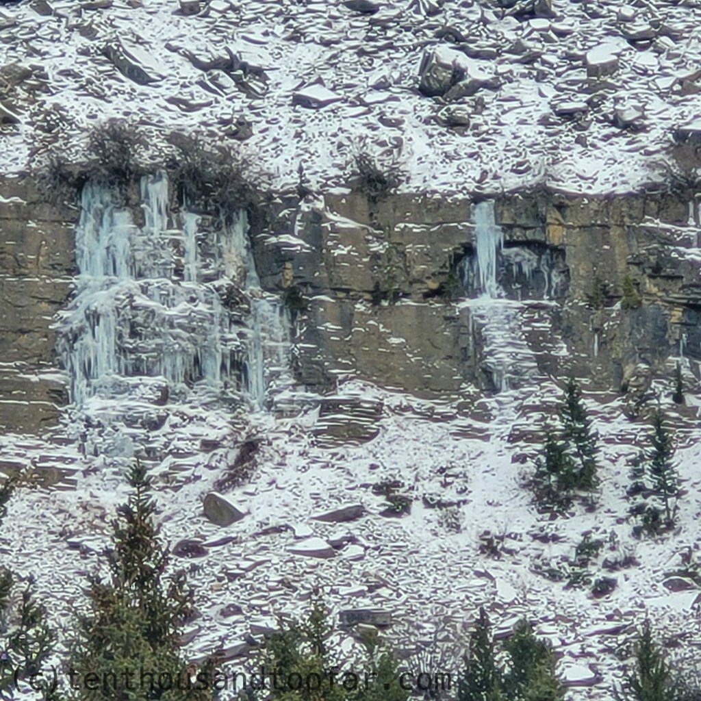 Right option of pitch one unformed. Left option of pitch one formed but quite thin, probably not climbable. Upper pillar looks better from the trail than it actually is. While there is a surprising amount of ice, the quality is disappointing – very new, very very very wet and very uninspiring.