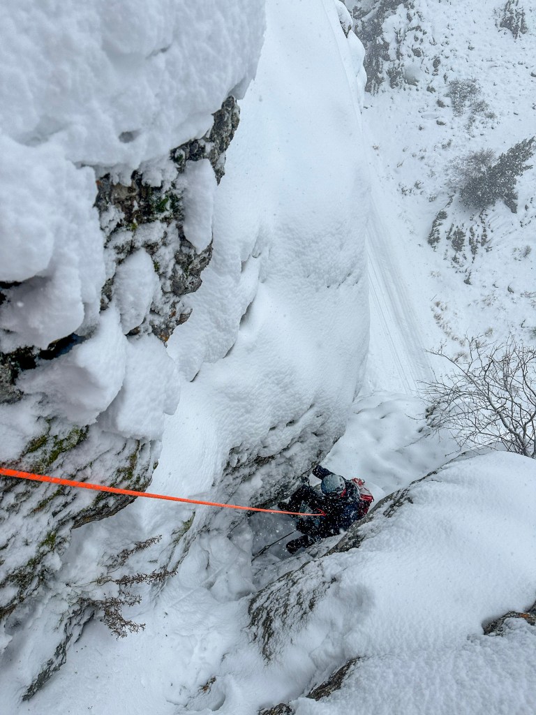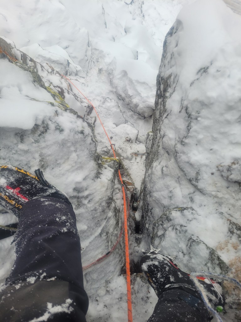 The first two pitches were entry fare, part of Jed’s lead block which would carry our team through pitch three. A few chockstones provided a bit of difficulty, but ultimately Jed led 90 meters with little more than a half-dozen protection points. Much to my shit grin, the rock quality far exceeded roadside impression. The water polished quartzite was grippy and bullet hard, allowing for confident climbing on abundant small edges. Our third lead deviated from the central weakness, up a right trending attractive slab ramp onto the steepening 800 foot central prow. A foot of sugar-snow made the lower angle climbing difficult, requiring extensive cleaning to reveal holds. Pitch by pitch I grew increasingly comfortable with this bizarre style of mountain climbing, eager for my first lead on pitch four.
