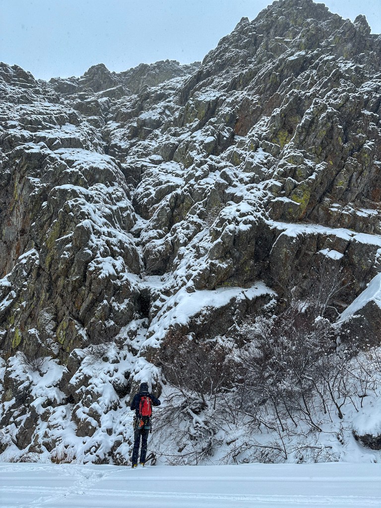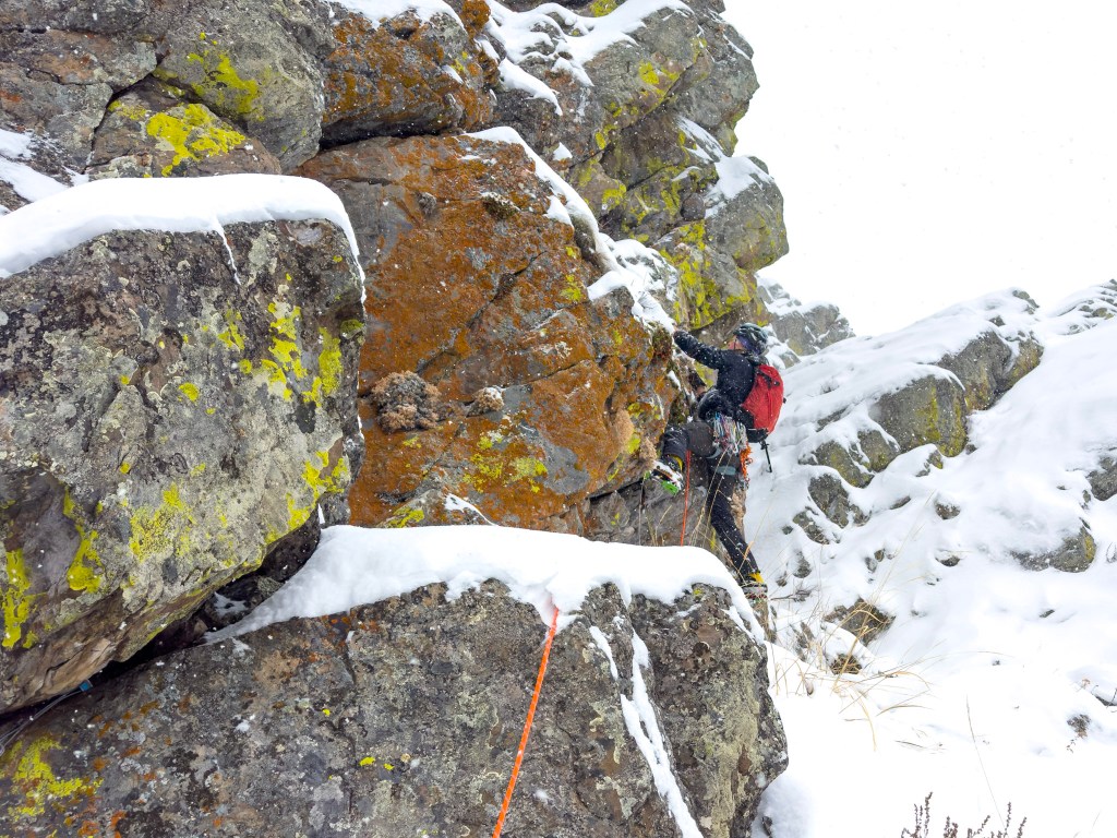 Multi-pitch mixed climbing in South Idaho? I was beyond skeptic when Jed reached out over Thanksgiving week with the proposition of a 1200 foot dry winter climb in an area I commonly associate with uninspiring rolling hills, crumbly basalt and widespread agriculture. However, a quick peruse of Mountain Project turned up favorable reviews for at least five long mixed lines on a jagged buttress that truly looked like a transplant from the high alpine. With choices from M2 to M6+ C1, we chose the median graded, area classic, Alpine Simulator, which receives the consensus grade of “5.7+, WI2, M4-5”, also known as 5.7+ in summer with rock shoes, some WI2 on a generous year and highly conditions dependent winter mixed climbing between M4 and M5? We prepared our minds for everything and more, with a healthy rack of cams, nuts and pitons. From the road the route was confirmed ice free, so we left screws in the truck. This was going to be an adventure.