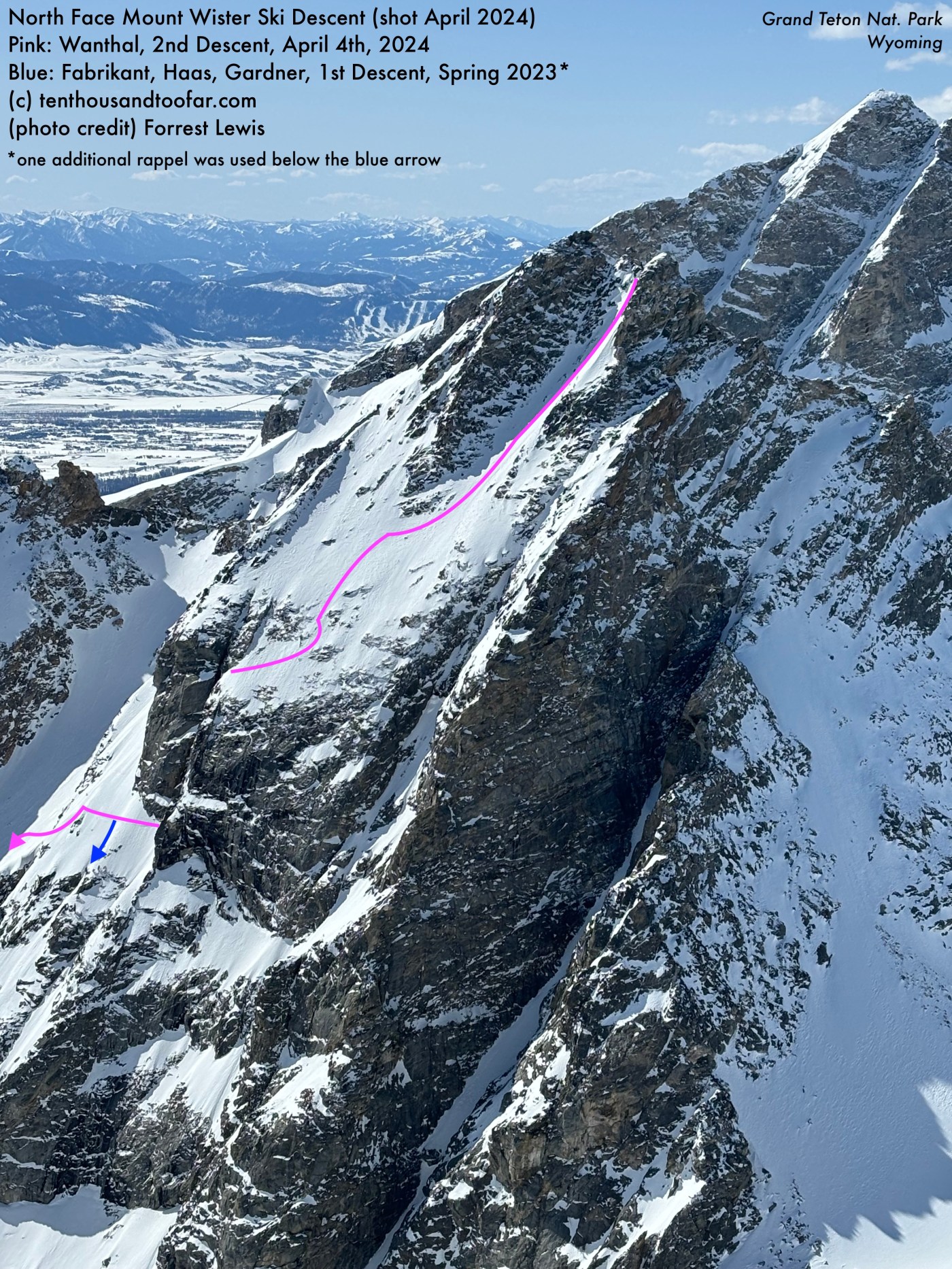 There’s very few first descents available in the core Teton Range – at least ones that aren’t marred by excessive rope work – so when I heard about local guides Adam Fabrikant, Billy Haas and Micheal Gardner skiing the North Face of Mount Wister last spring, a face I’ve skied beneath at least a dozen times, I was floored. I toured up Avalanche Canyon soon after and immediately my eyes popped – there was something there. A continuous 800 foot snowfield hangs precariously above a 300 foot cliff, with a plenty wide canvas for linking quality steep turns the entire way. Below the monster rappel, a complex apron with a variety of exit strategies provides another 1300 feet of quality skiing (with either one or no rappels) to the canyon bottom. Ruminating on their descent was a paradigm shifting experience. I’d been staring at this commanding north face for the better part of decade, and long had an affinity for an airy jump turn or twenty, but only through Adam, Billy and Mike’s vision was I able to digest this very skiable line and conceive my own adventure. As the terraced cliffs nearing the bottom of the upper face gradually filled in with generous pulses of late winter moisture, my efforts to corral a partner fell on deaf ears. Then I skied a handful of steep descents that calibrated my ski mountaineering spidey senses. Then I had two partners fall victim to work obligations on the final day of a brief high pressure window. Last year the face quickly faded out of condition with the first April warm spell, and I just couldn’t stomach the idea of spending another twelve months daydreaming about this line. Then I found myself over caffeinated and alone in the Bradley-Taggart lot, bag full of bangable steel, sharp things and rope… head full of dreams. I was ready to take my shot.