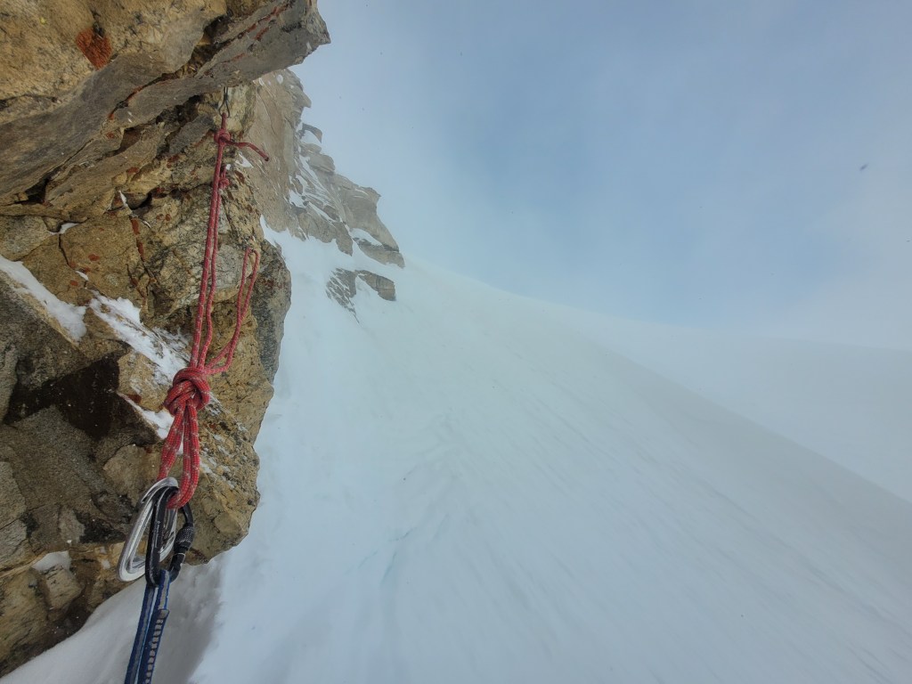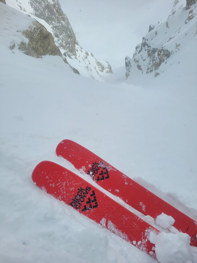After two weeks of mostly steady high pressure, a short pulse of moisture dropped up to ten inches across the Teton Range, blown every which way by extremely bipolar winds. I hadn’t the faintest clue what to expect, except that yesterday’s Turkey Chute skied surprisingly well – a similar aspect and elevation to 10,696’s North Couloir. I carried a rope and relatively robust rack, expecting up to two rappels and an absence of fixed anchors. I reached the summit via Mavericks in a little under three hours. Much to my surprise I was able to keep skis on for the entry, side stepping through some exposed rock and straight lining through a small notch into the top of the line. The steepness and exposure caught my attention immediately, my inclinometer confirming a slope angle of 55 degrees and my rational brain calculating that a fall at any point in this twisting little beast was likely to be fatal, especially given the extreme disparity of fresh snow. After two unruly turns through a nasty breakable crust above the first crux, a constriction with an exposed rock slab guarding the main couloir, I heavily considered bailing – but hopes and dreams of yesterday’s fresh wind buff seduced me into continuance. I utilized dry skiing tactics to edge my way over a smooth sugar dusted slab, and was immediately faced with bulletproof glaze hidden beneath a one centimeter varnish of pasted fluff, classic dust-on-crust ski mountaineering conditions – barely edgeable. I once again pondered retreat, but the idea of reversing the slab crux I just slipped, and changing over to crampons on a slope this firm, was a bit daunting. My ice intuition from 15 years of skiing in Massachusetts and New Hampshire clicked into hyperdrive as I made my way towards the sweeping mid-run cliff, finding the now 40-45 degree bulletproof jump turns surprisingly routine and rhythmic with factory sharp edges on a new pair of Black Crows Camox Freebird skis, which gripped remarkably well with little chatter. As the slope rolled back over nearing the cliff, and my skis began to resist purchase on intermittent solar runnels, I stopped worrying about turning and started looking for anchor opportunities. I spotted a faded fixed anchor guarded by a substantial wind drifted fin that seems to form every year, but as I sidestepped my edges into it I got some hollow sounds, and quickly realized that if this fin was to break – not entirely improbable given the bed surface I just skied – then I’d be in for one hell of a ride. Despite the tat being all of five feet away, I resisted temptation and took advantage of a convenient crack at eye level, banging in an inverted angle piton and two stoppers. My wallet groaned with every swing of the hammer.
