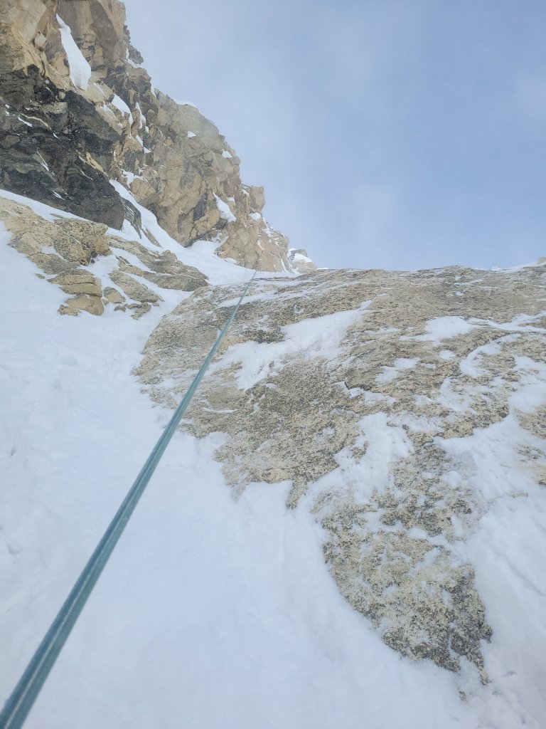 - The upper half of the couloir has a steep and unobstructed NE tilt, catching more sun in the morning than expected. This explains the stouter than expected solar crust following a spring high pressure system, the runnels approaching the crux cliff and the undesirable collection of wet loose debris in the lower couloir.