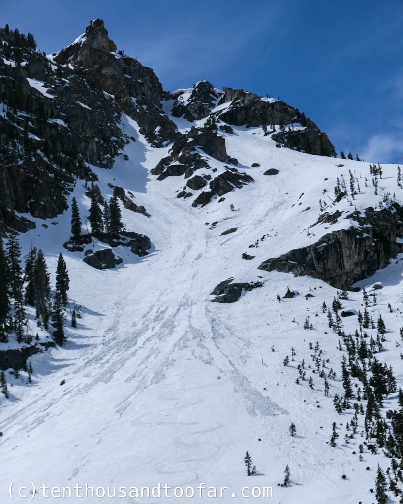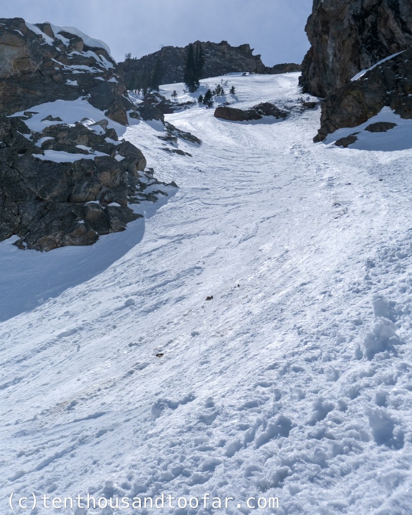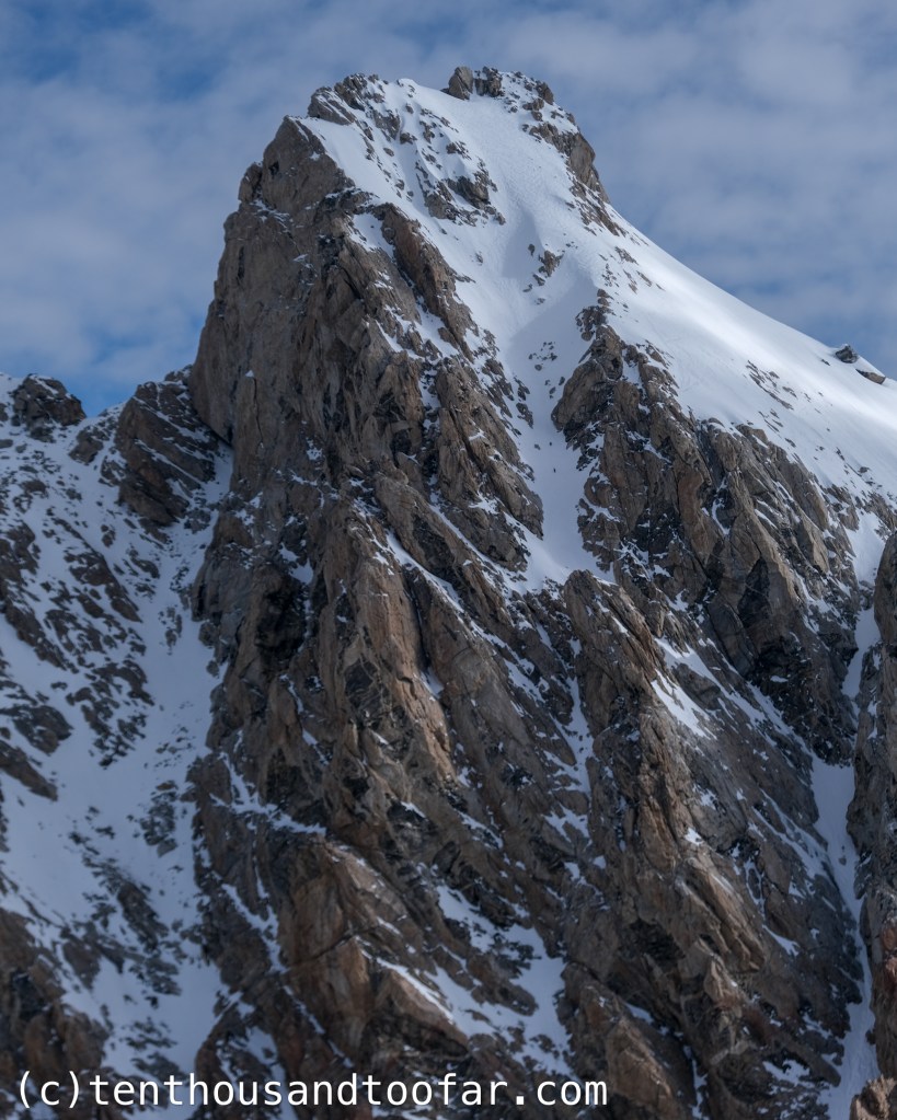 I left the car solo around 4:00AM and made a nearly continuous on-snow ascent into Garnet Canyon separated by only small bouts of dry hiking. I rolled the dice, center-punching an anemic Bradley Lake and nearly paying the price when my skis busted through thin ice on the far shore. Luckily only the top sheets submerged (preserving the integrity of my dry socks), and snow surfaces were well-enough frozen to resist glopping. I sauntered into the South Fork of Garnet by hour three and was delighted to find the South Couloir of the rarely skied Dike Pinnacle in ski-through shape. (for any avid TetonAT.com readers, Steve Romeo called this line the Southeast Couloir – however, in my opinion the line really faces due south, and another couloir on the Dike Pinnacle is more apt to be named the “Southeast”) I had tried the South once before in February of 2022 but turned around due to a shark tooth snowpack underpinning a highly reactive windslab. Today the couloir was generously filled, lightly desecrated with debris but acceptable for an open mind. A soft overnight freeze made for difficult boot-packing through a robust breakable crust, which I prayed to the ski mountaineering gods would support my skis on descent. A thin icy band at the top of the couloir led to the upper east face and ridge, where the snow hardened to supportable neve and provided a delightful exposed climb to the ~12,400 summit by 8:30. A glaze of wispy clouds prevented solar warming, and I spent nearly an hour on the summit watching a few late parties make their way up the Chevy and Ford Couloirs en route to the summit of the Grand Teton. Eventually I got bored and decided to use my Ice Coast upbringing to its fullest potential, skiing the exposed east ridge in just edge-able baby corn conditions and forking right into the South Couloir for a deafening descent of chattery jump turns between bulletproof chicken heads. I’ll certainly have to return and ski one of the many other attractive lines on the Dike Pinnacle in more favorable conditions, but I was satisfied with the opportunity to hone my firm snow technique and get oriented on what I believe to be one of the most inspiring and underrated ski objectives in Garnet Canyon. This was my first with skis, and second total, summit of the Dike Pinnacle – and I’ll certainly be back.