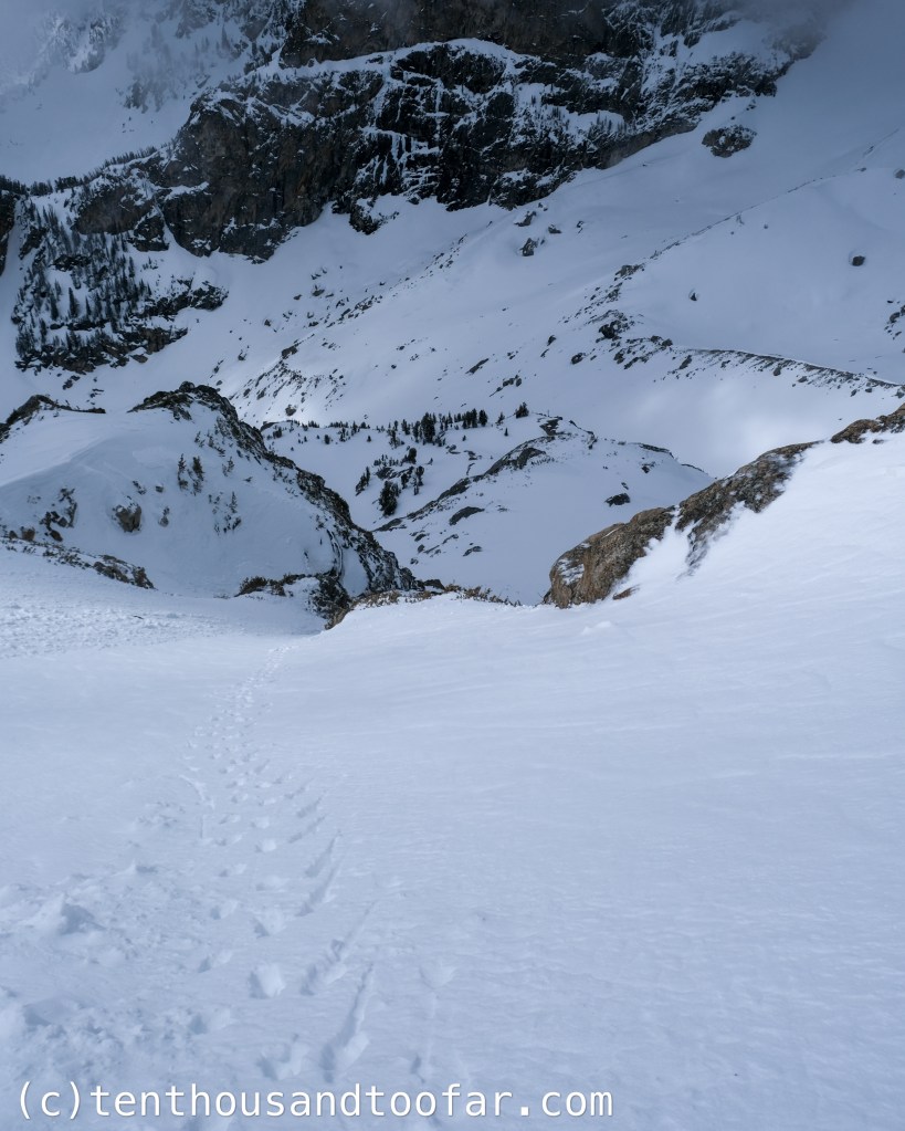 All things considered, there was nothing glamorous about this day. The approach sucked, the climbing basically sucked and the skiing was marginal, though as the memory fades I’m always happy I got out, rather than sitting at home twiddling my fingers and cracking out on coffee, festering, during a stormy spring day. In good conditions this line has all the components of a classic Teton couloir ski descent, with the added bonuses of a relatively short and straightforward approach, and being absolutely beautiful to admire from afar.