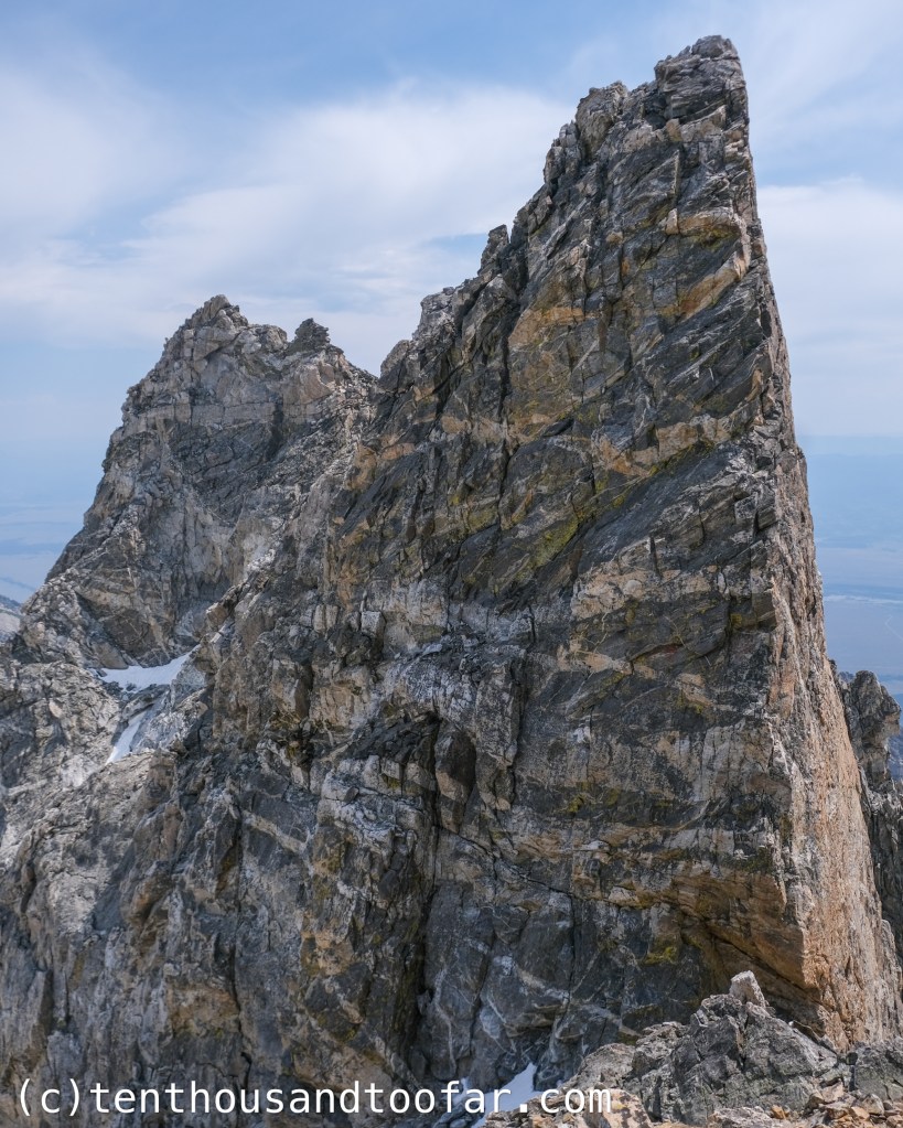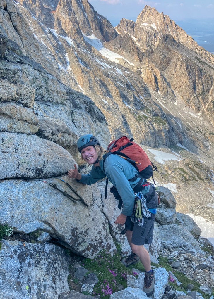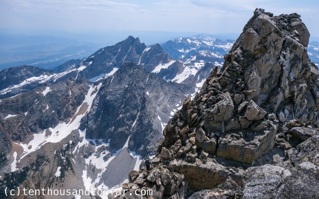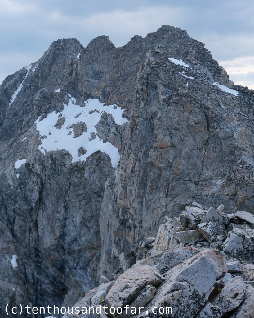 Our original cut-off time for continuation to Nez Perce, the final peak of the traverse, was 5:00PM – we were 103 minutes behind schedule. A quick scan through Mountain Project reveals the eastern col of Cloudveil as the bailing point for many. A convenient snowfield and climber’s trail descends directly from this point into the South Fork of Garnet Canyon, and unlike the other six peaks of the traverse, all packed together like sardines, Nez Perce is a fair distance and several hundred feet of climbing away. Frankly, given it’s extreme separation from the other six peaks continuation to Nez Perce almost feels contrived, and there are a few attractive towers on Nez’s West Ridge that are not formally included on the traverse, but almost seem criminal to skip. Hyper focused on the objective we decided to forge on, but ended up clipping our own wings two different ways. First, we decided on purism and attempted to traverse the two or three small towers on the West Ridge, the first successfully and the remaining to no avail, which appeared to require difficult fifth class climbing with no guarantee of anchoring opportunities. At this point we jumped off the crest and resolved to continue along the standard route, but by now the sun was fading. The standard Northwest Couloirs route is notoriously difficult to follow, and despite having descended the route once before I made a critical and common error, climbing to a false summit on the West Ridge instead of following a ledge system further east. This highpoint, separated from Nez Perce by a deep notch and 100 foot vertical wall, harbors a formidable rappel anchor suggesting we weren’t the only ones to make this mistake. By the time we rappelled from the false summit and course corrected the final waves of daylight crimson were being replaced by stars and blackness. Despite standing a mere 150 feet from the summit, we realized the eminent need to fold our cards and escape from the technical, route-finding intensive upper mountain before headlamp hour.