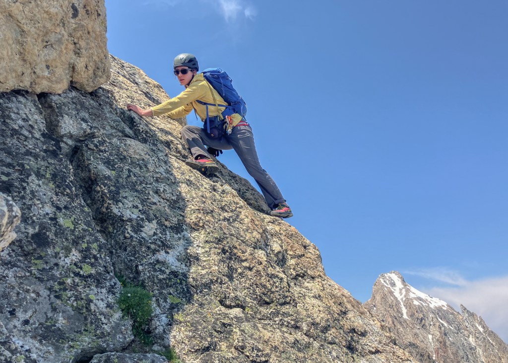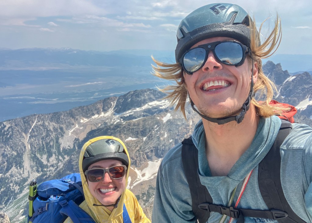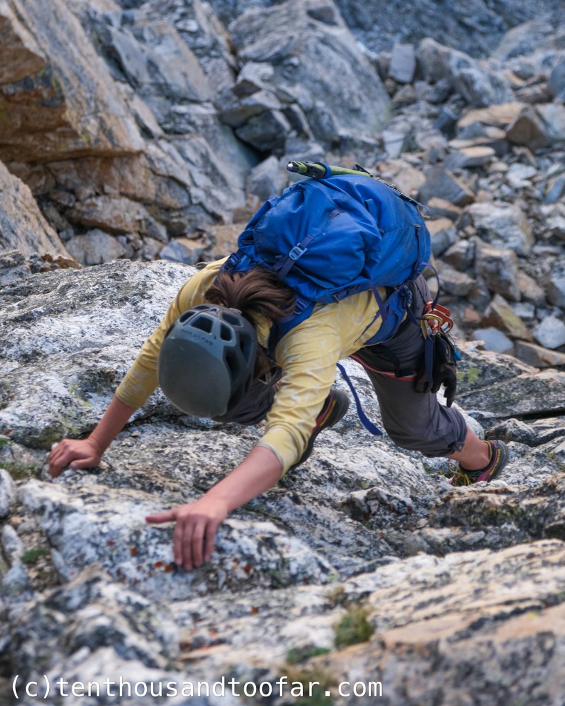 We conveniently intersected with two friends at the Lupine Meadows Trailhead, so we approached the Meadows as a conversation filled team of four. They were headed to attempt the Gold Face (5.10-, III) on the Grand Teton, a valiant goal, and we bid them adieu at the confluence of the North and South Forks. A few pesky snowfields in the South Fork, and some surprise high winds coupled with dark clouds that forced us to meticulously check weather multiple times, delayed our South Teton summit time until approximately noon, some five hours after leaving the car. We encountered our first technical terrain down-climbing the East Ridge of the South Teton (4.0), and stayed engaged with steady exposed scrambling of at least fourth class for the next few hours. We climbed the West Face of the Ice Cream Cone (5.6) in approach shoes with a single 35m, 7.7mm half-rope and light alpine rack of five cams, five nuts, one tri-cam, four 60cm alpine draws and two 60cm shoulder slings. Once again, both Bobbi and I marveled about how incredibly loose and steep the West Face looks from the summit of the South, juxtaposed against how solid the rock, and manageable the climbing, actually is. We made quick work down the gentler East Ridge of the Ice Cream Cone (4.0) and over the Unnamed Blob (4.0) until hitting a steeper step on the West Ridge of Gilkey’s Tower. In my opinion this step registered in the low-5th class range, and I was incredibly impressed by Bobbi’s ability to calmly negotiate a body length or two of vertical climbing with multi-thousand foot free fall potential. A foot pop here provides an express shuttle to Lake Taminah, and I certainly felt the air. No more than 100 feet higher Gilkey’s threw another curveball, a knife’s edge false summit where a lone shiny bolt with rappel rings, presumably upkept by local guides, will be found. The bolt helps facilitate another wildly exposed 5th class step, this one a polished and slabby downclimb along a thin seam with longer reaches between quality footholds than desired. Bobbi opted for the rope, and since a line was already rigged I did the short rappel too, but after pulling the cord I free-soloed up and down this seam just to open the door for potential future rope-less exploits on this ridge. Turns out there’s just enough handholds to feel secure, but for a “fourth class” ridge I thought this particular downclimb was a significant sandbag, and coupled with the preceding step forms an obstacle more technical than anything on the Grand Teton’s Upper Exum Ridge (5.5, II). One thing is for sure, the seam would be a nightmare in wet conditions.