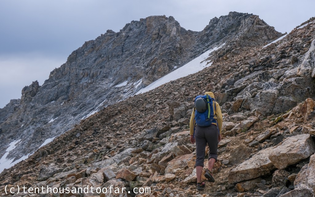 The Cloudveil Traverse is a linkup of seven peaks following the geologic extension of the South Teton’s East Ridge to it’s terminus at Nez Perce. The traverse begins at the South Teton (12,519′), climbing the Ice Cream Cone (12,400′), Unnamed Blob, Gilkey Tower (12,320′), Spalding Peak (12,240′), Cloudveil Dome (12,026′) and Nez Perce (11,906′). The route features a seemingly endless amount of 4th and low-5th class climbing on a remarkably exposed ridge network, and one formal 40 meter pitch of 5.6 rock climbing on the West Face of the Ice Cream Cone. According to a SummitPost article the route contains approximately 8000 feet of elevation gain. We attempted something of a Cloudveil Traverse two years ago, the day after climbing the 3000 foot Dike Route (5.6, IV) on the Dike Pinnacle, with continuation to the summit of the Middle Teton via the East Face (5.4, II). We slept in the South Fork of Garnet Canyon and made our bid for the traverse the following day, but fatigue combined with an early thunderstorm assault rushed us back to terra firma from the summit of the Ice Cream Cone. Today we aimed to travel light, move swiftly and complete the traverse car-to-car. The weather was totally splitter and the vibes high. Plus, we were better climbers. We kinda thought we had it in the bag.