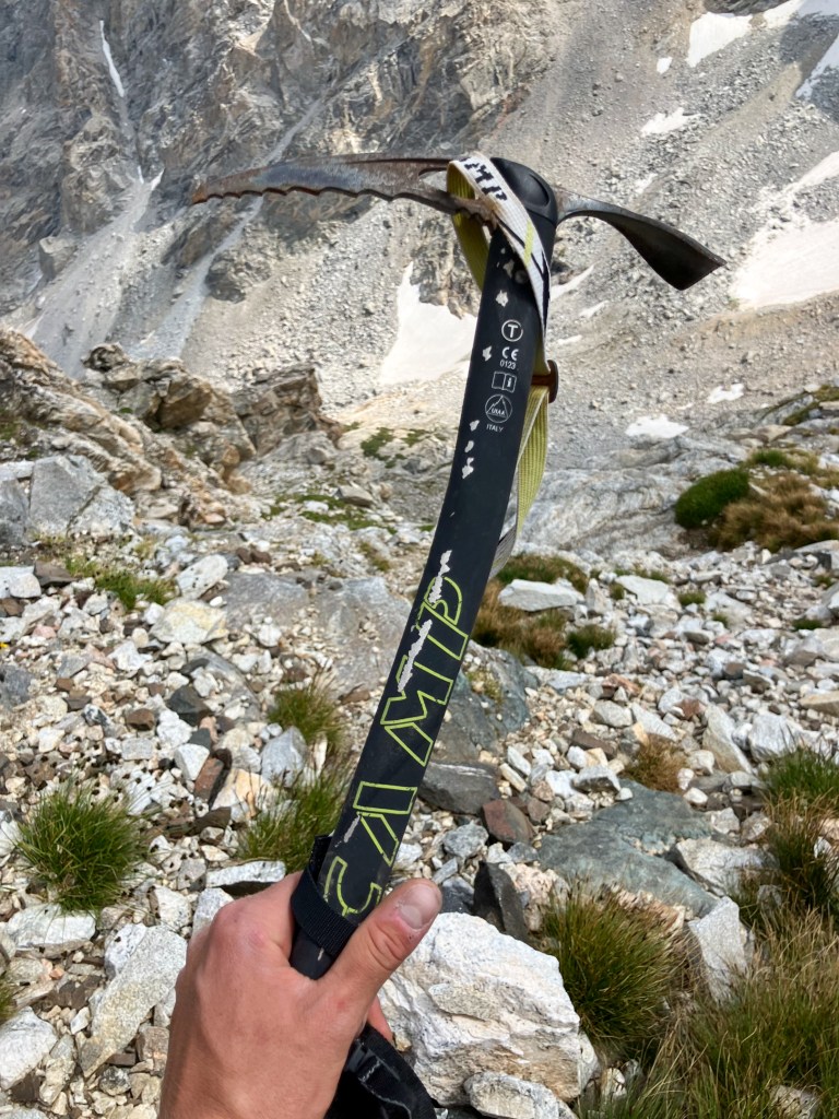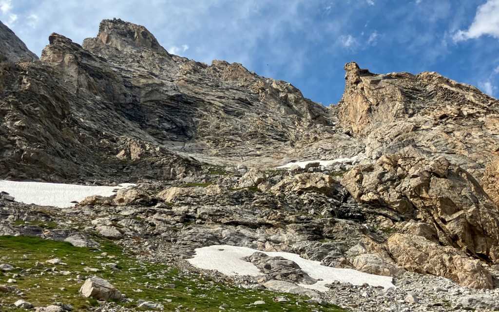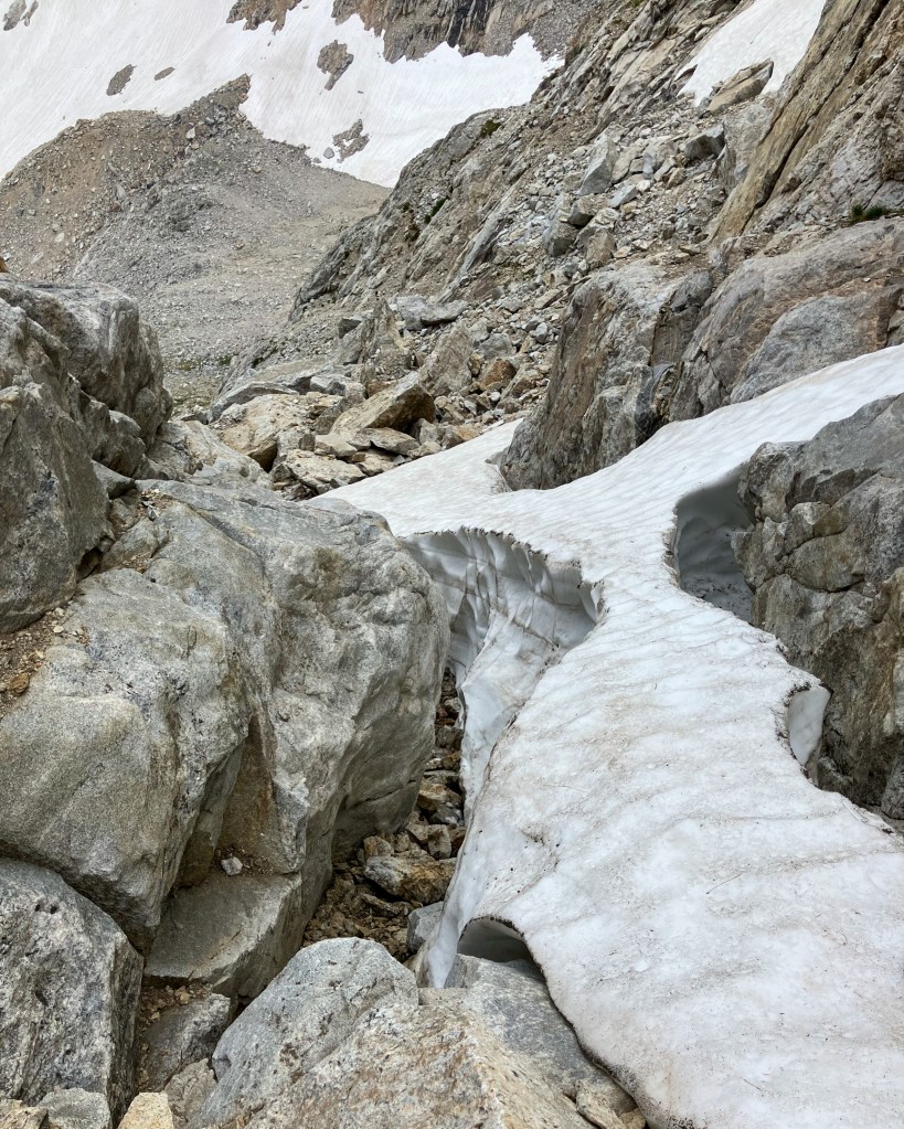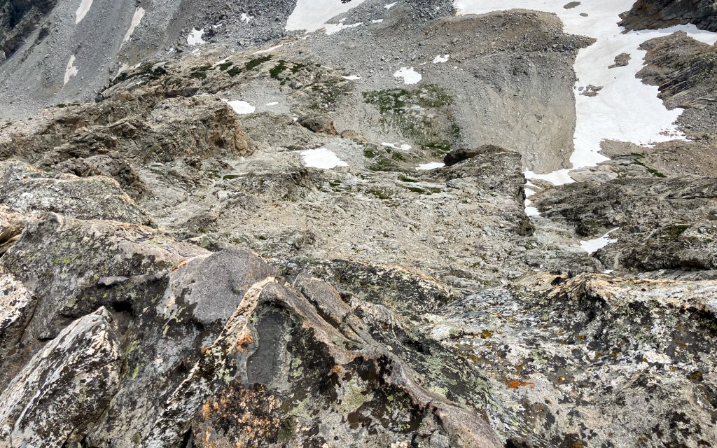 Because of my reluctance to carry the 60 meters of rope needed to rappel into the notch separating the Dike Pinnacle from the Middle Teton, and down-climb the dubious 5th-class stone on the west face between the rappels, I opted to retreat directly into the south fork of Garnet Canyon (more information on the continuation to the Middle Teton summit can be found here). The Ortenburger-Jackson guidebook offered a crude route into the canyon via the east ridge and either the Southeast Couloir or south face – the latter wasn’t exactly clear. Hours later I was still onsighting the mess of steep, loose and unsuspectingly technical terrain, cursing the guidebook for suggesting such a serious descent route with vague, if not casual, language. The book suggested two optional rappels to pass large chockstones, yet I found no signs of anchoring and was able to down climb the fifth class difficulties around both distinct obstacles. In hindsight I basically descended the eastern extremity of the south face along a shallow couloir until a ramp system provided a convenient traverse east into into the Southeast Couloir. In the larger Southeast I was greeted by widespread lingering isothermal snow. Although I had found an old ice axe on the south face, this snow was a bit too steep and consequential without crampons, and a bit too soft for reliable self arresting. Some slippery chimneying between the robust snow flank and exposed rock led to a chossy and wet lower couloir, and because of my reluctance to touch any more snow I opted for a rock detour around a lower snowfield that involved some exposed onsight 5.6-ish down-climbing on fortunately stellar, avalanche polished, granite. I reached the South Fork approximately 2.5 hours after leaving the summit, thoroughly dehydrated and ready for just about anything besides mountain climbing.