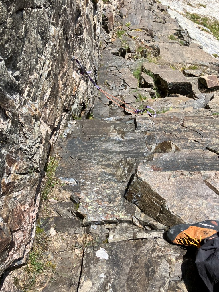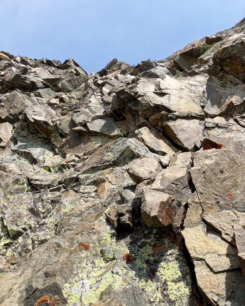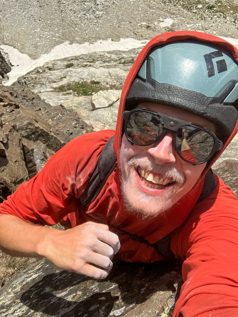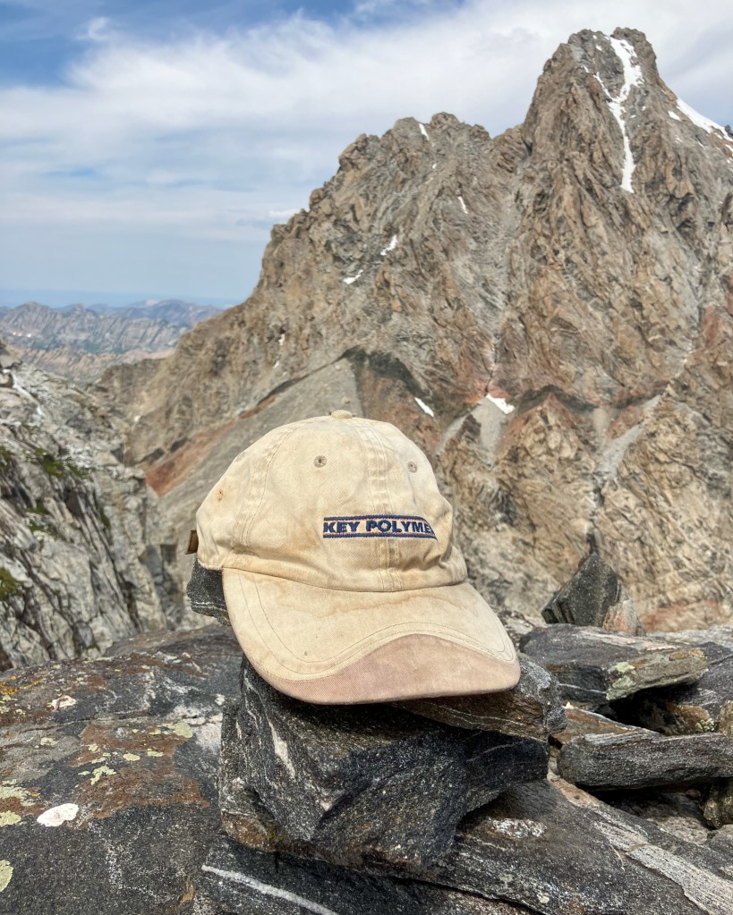On the upper mountain the dike eases off into standard unroped “mountain terrain”, weaving between third, fourth and low-fifth class terrain en’ route to a beautiful, seldom visited, 12,400 foot summit. Two parties dotted the classic Buckingham Ridge on the Middle Teton, and several others gathered atop the Middle Teton summit almost certainly via easier routes on the southwest and north faces. On the Dike Pinnacle I was all alone. I popped off my shoes and made a padded lounge with my shirt and jacket for some sunbathing on a particularly smooth granite slab. The Dike Pinnacle is one of my favorite summits in the park, for no reason other than my uncanny affinity for atypical summits, routes and descents that are equally awesome as the classics, yet somehow fly beneath the radar. I first visited the pinnacle in 2022 with Bobbi, and returned this past winter for my first ski descent via the East Ridge and Southeast Couloir. I built a small cairn from some convenient plates and spent a few moments reflecting on my father who passed away in these mountains seven years ago. I put his, and now my, favorite hat – Key Polymer being the epoxy company he worked at for my entire childhood – on the cairn. For whatever reason his presence was especially significant today.